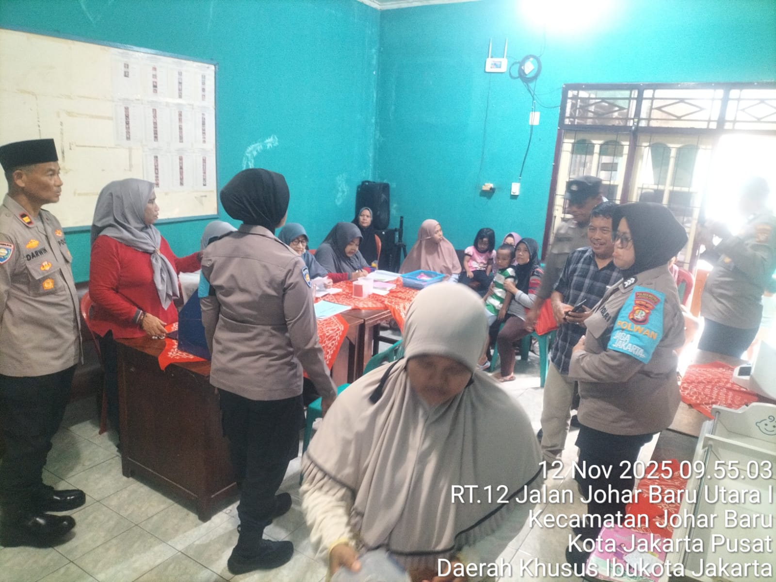 Jakarta Pusat – Dalam rangka mendukung kesehatan masyarakat dan memperkuat kemitraan Polri dengan warga, Polwan Jaga Jakarta bersama Kanit Binmas Polsek Johar Baru Iptu Darwin Effendi dan jajaran Bhabinkamtibmas melaksanakan monitoring kegiatan Posyandu Balita di Sekretariat RW 03 Kelurahan Johar Baru, Rabu (12/11/2025) pukul 10.00 WIB.