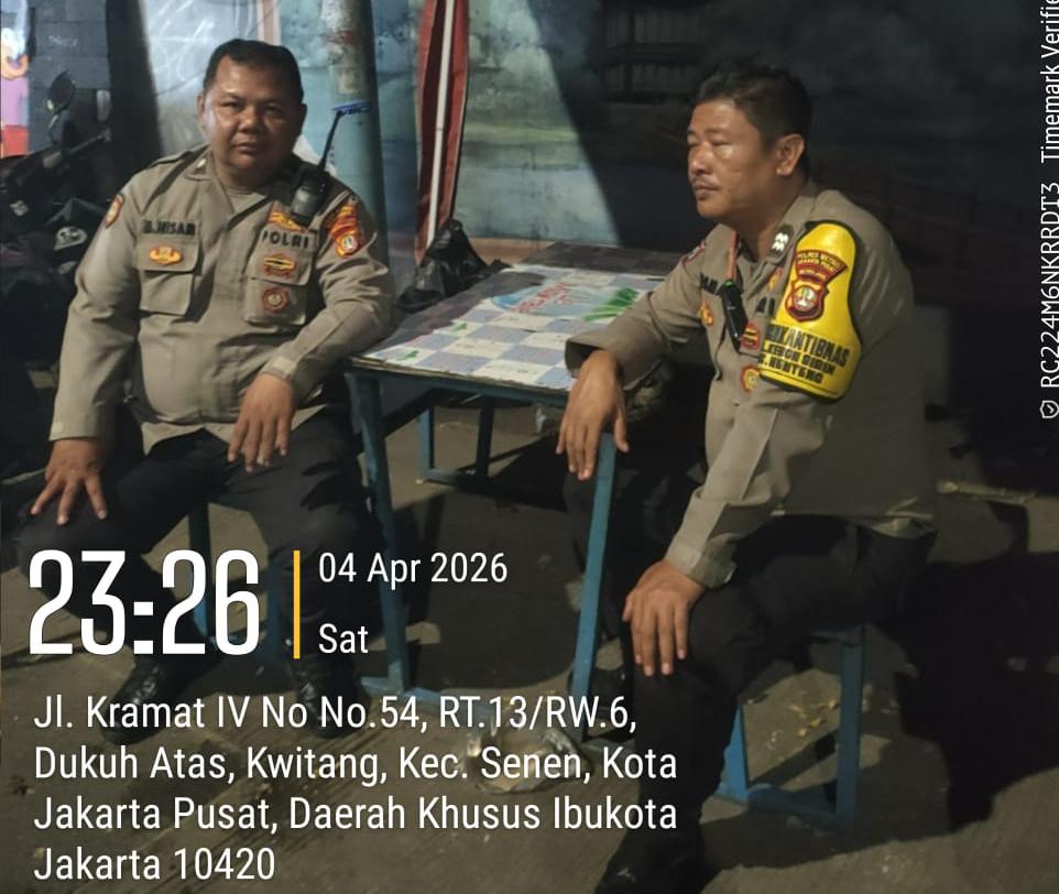 Jakarta Pusat – Mengantisipasi meningkatnya aktivitas masyarakat selama libur panjang, jajaran Polsek Metro Menteng memperkuat pengamanan di wilayah rawan. Bhabinkamtibmas Kelurahan Kebon Sirih, Aiptu Ujang Rusman, bersama personel Polsubsektor Aipda Hisam dan warga melaksanakan pemantauan intensif di perbatasan Kalipasir, Menteng, Jakarta Pusat, guna mengantisipasi potensi gangguan kamtibmas, pencurian kendaraan bermotor (curanmor), serta tawuran warga. Minggu (5/4/2026)