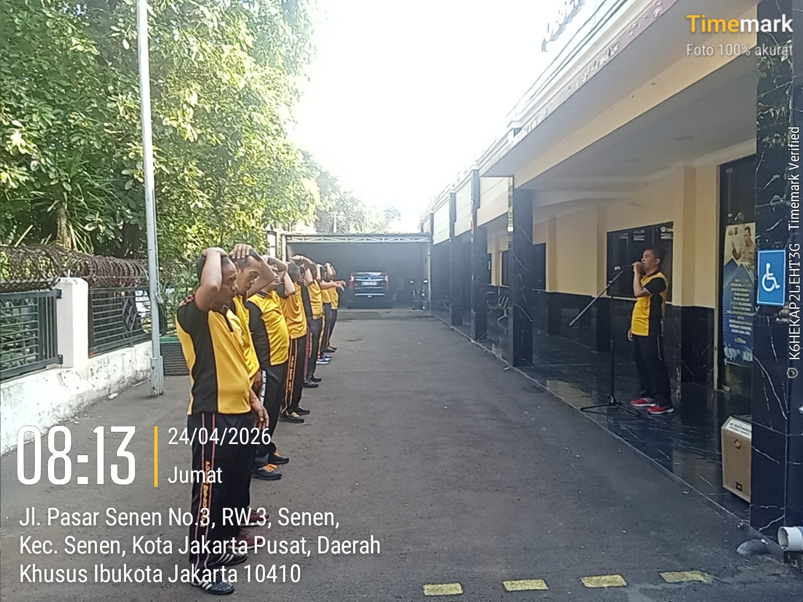 Jakarta — Personel Polsek Senen menggelar apel pagi yang dilanjutkan dengan kegiatan olahraga dan kerja bakti (korve) di halaman kantor Polsek Senen, Jakarta Pusat, Jumat (24/4/2026).
