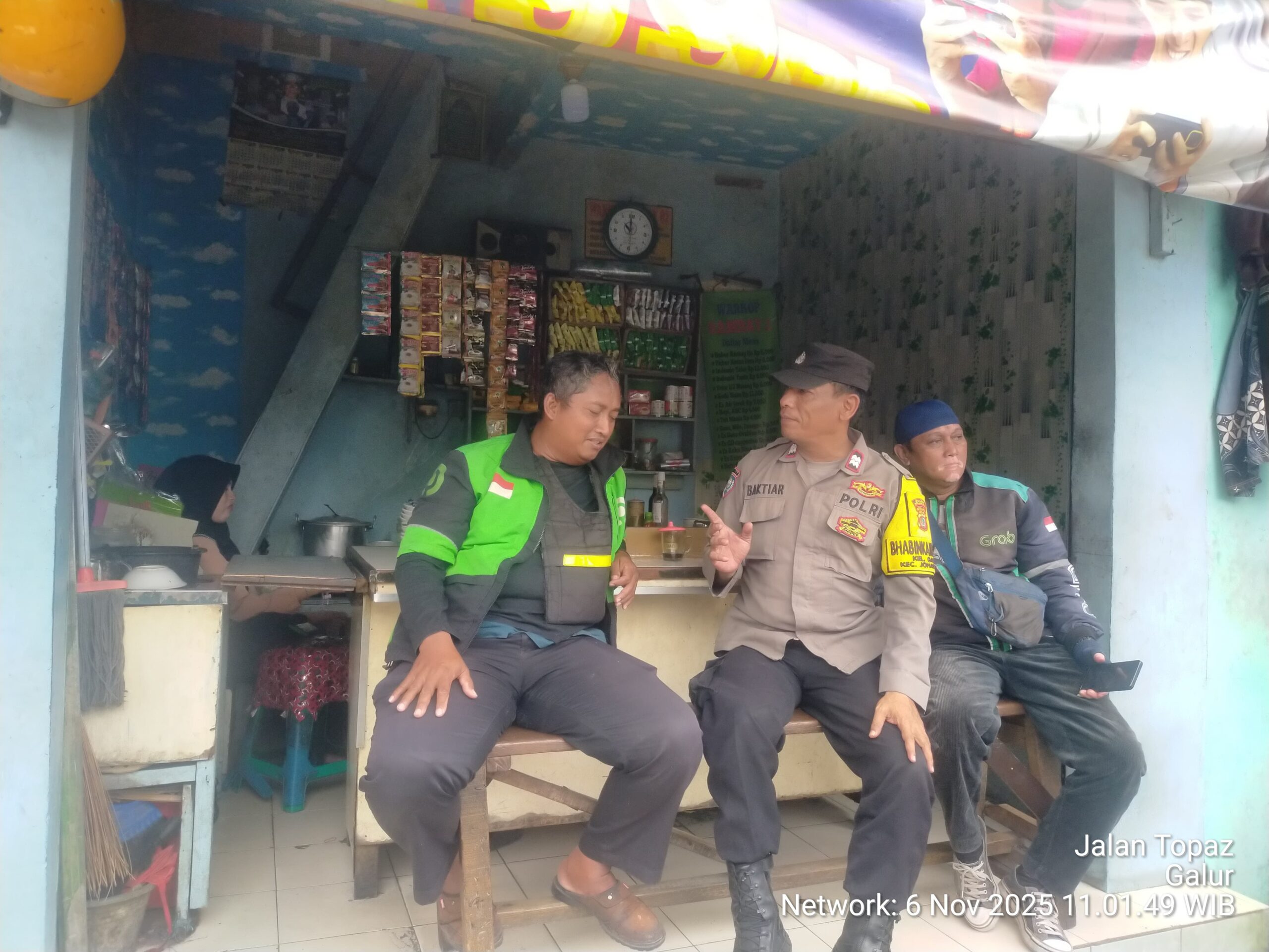 Jakarta Pusat – Untuk memperkuat keamanan lingkungan dan mempererat sinergi dengan masyarakat, Bhabinkamtibmas Kelurahan Galur, Aiptu Baktiar, melaksanakan sambang wilayah dan cooling system di Warkop Jalan Galur Jaya RT 003/04, Kelurahan Galur, Johar Baru, Jakarta Pusat, Kamis (6/11/2025) pukul 11.00 WIB. Kegiatan ini turut melibatkan Pak Amir dan beberapa pengemudi ojek online setempat.