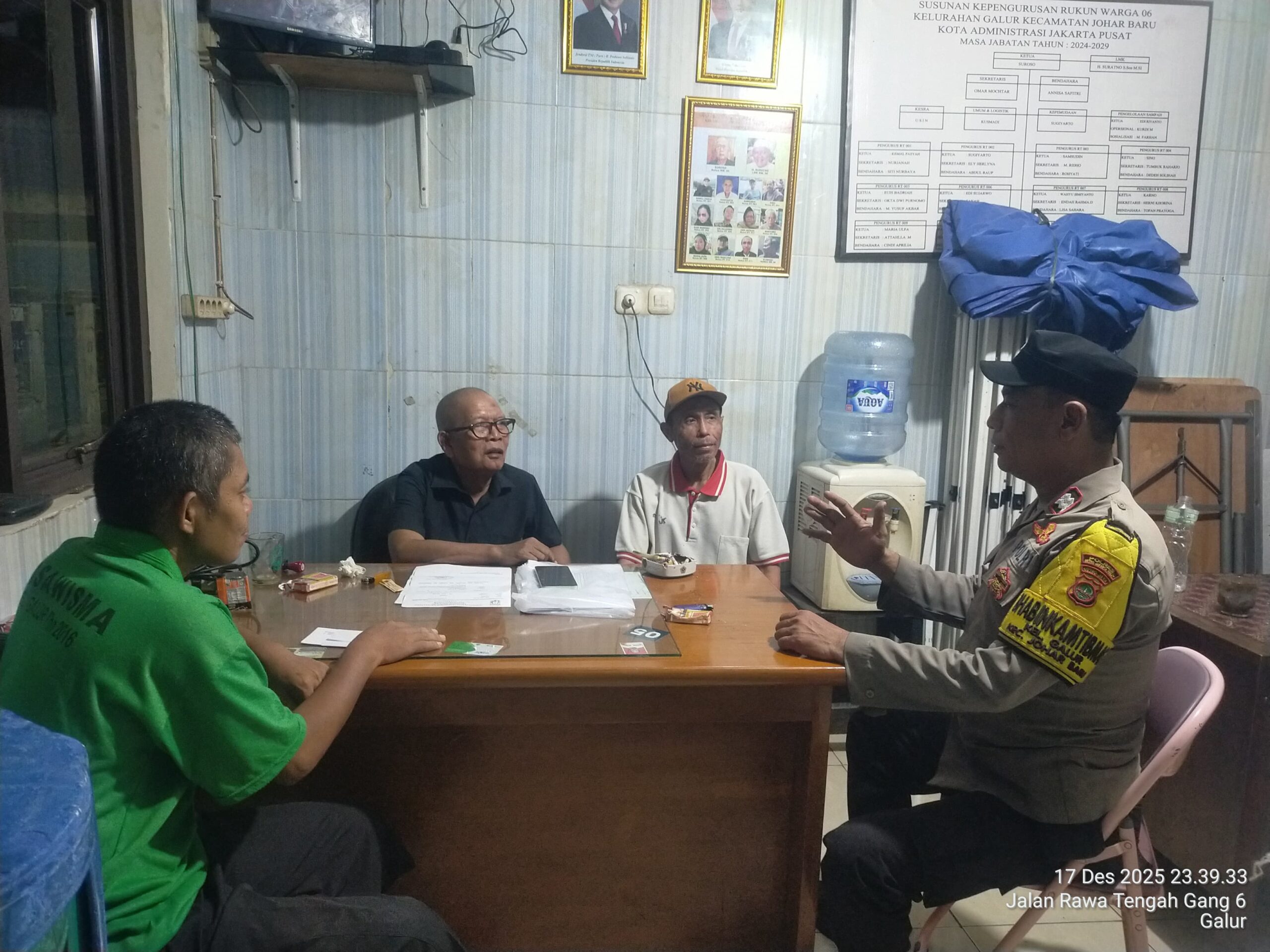 Jakarta Pusat — Guna menjaga keamanan dan ketertiban masyarakat (kamtibmas) pada jam rawan malam hingga dini hari, Bhabinkamtibmas Kelurahan Galur Polsek Johar Baru melaksanakan kegiatan sambang dan cooling system di Pos Kamling RW 06, Jalan Rawa Tengah, Kelurahan Galur, Kecamatan Johar Baru, Jakarta Pusat, Rabu (17/12/2025) malam.