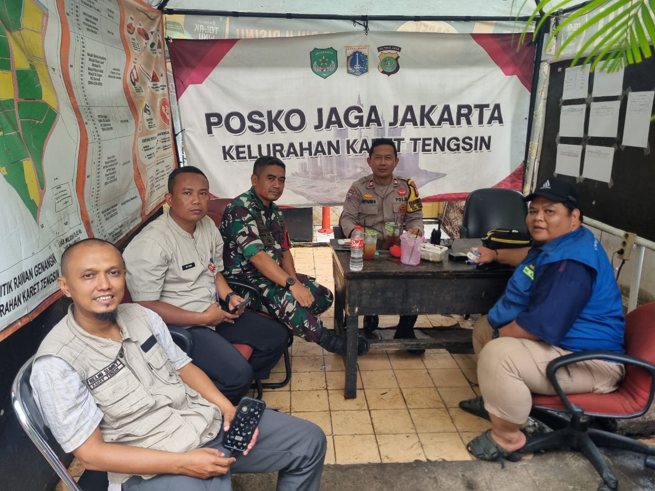 Jakarta Pusat — Bhabinkamtibmas Kelurahan Karet Tengsin Aiptu Suparmin bersama Babinsa melaksanakan kegiatan kunjungan dan koordinasi ke Posko Jaga Jakarta Kelurahan Karet Tengsin di Jalan Karet Pasar Baru Barat VII RT 09/02, Karet Tengsin, Tanah Abang, Jakarta Pusat. pada Jumat sore, (9/1/2026).
