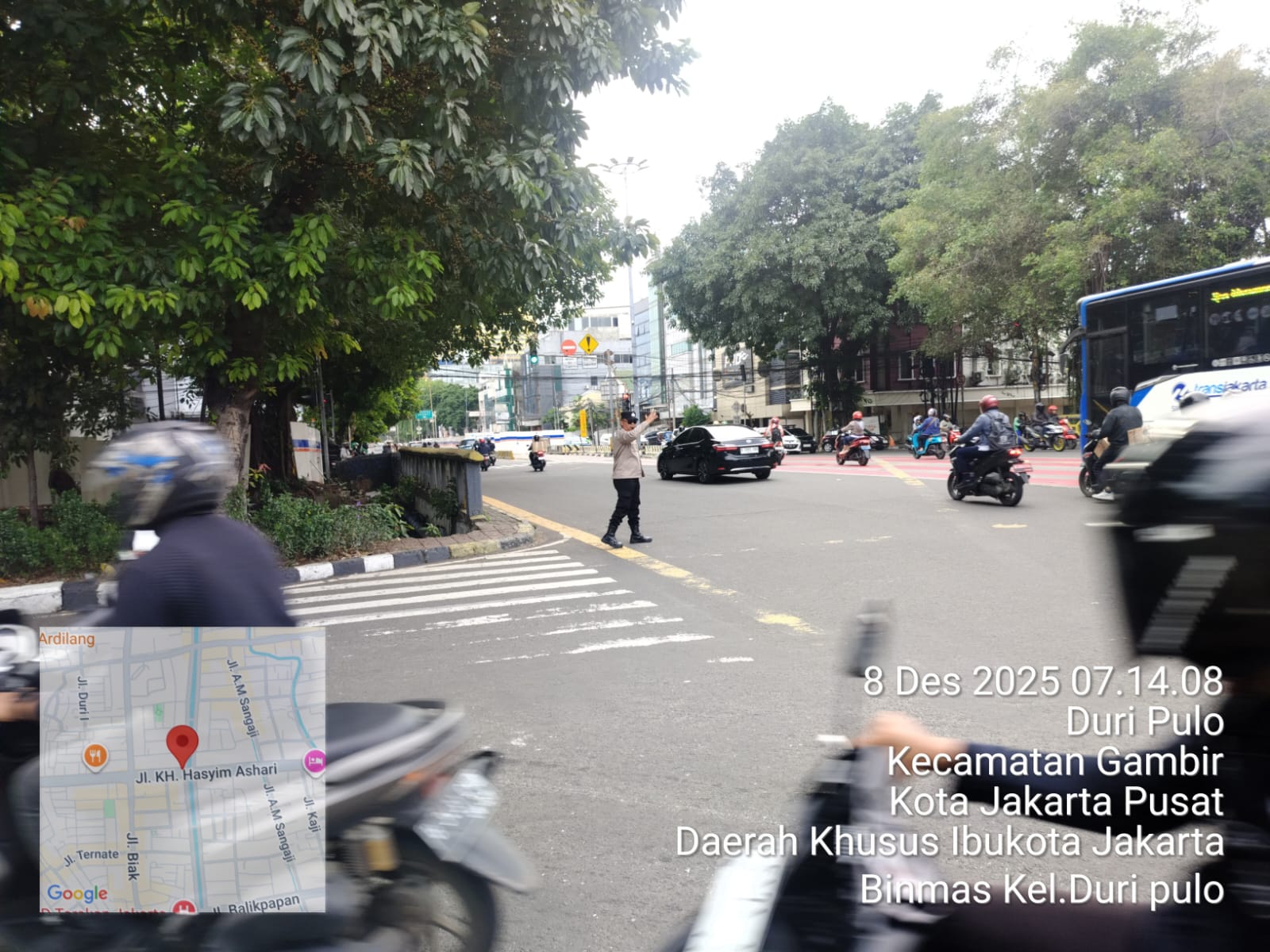 Senin, 8 Desember 2025 — Pagi di kawasan TL Cideng, tepatnya di depan Holland Bakery, selalu menjadi momen tersibuk bagi para pengguna jalan. Arus kendaraan dari berbagai arah bertemu di satu titik, menciptakan kerawanan kemacetan bila tidak ditangani dengan cepat. Untuk itu, Bhabinkamtibmas Kelurahan Duri Pulo, Aipda Purwanto, hadir lebih awal untuk melaksanakan ploting dan pengaturan lalu lintas.