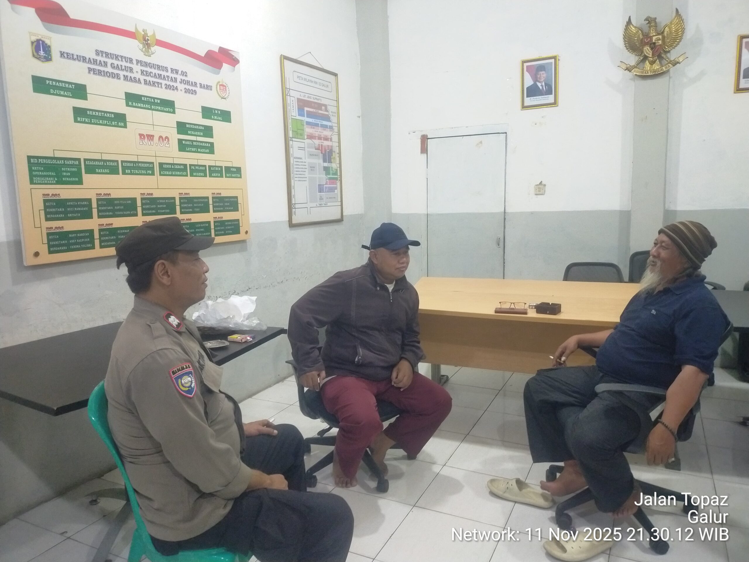 Jakarta Pusat – Bhabinkamtibmas Kelurahan Galur, Aiptu Baktiar, melaksanakan sambang Poskamling RW 02 di Jl. Topaz, Kelurahan Galur, Johar Baru, Selasa malam (11/11/2025) pukul 22.00 WIB. Kegiatan ini bertujuan untuk deteksi dini gangguan keamanan dan ketertiban masyarakat (Guantibmas) serta menjaga situasi wilayah tetap aman dan kondusif.