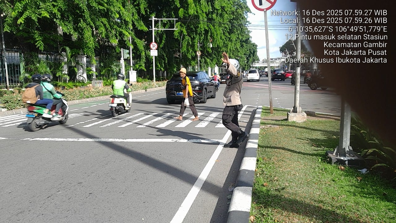 Jakarta Pusat — Guna menjaga kelancaran dan keamanan aktivitas masyarakat di jam sibuk pagi hari, Bhabinkamtibmas Kelurahan Gambir Polsek Metro Gambir, Aiptu Amirullah, melaksanakan kegiatan pengaturan lalu lintas dan pengamanan kewilayahan pada Selasa pagi, 16 Desember 2025, di kawasan A–1.2 Jalan Medan Merdeka Timur, Kelurahan Gambir, Jakarta Pusat.
