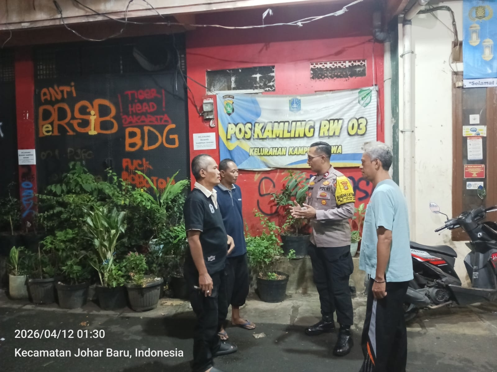 Jakarta Pusat – Upaya menjaga keamanan dan ketertiban masyarakat (kamtibmas) terus dilakukan melalui kehadiran langsung aparat kepolisian di tengah warga. Bhabinkamtibmas Kelurahan Kampung Rawa melaksanakan patroli wilayah dan sambang Satkamling di Pos Kamling RW 03, Jalan Rawa Sawah 4 RT 07/RW 03, Kecamatan Johar Baru, Jakarta Pusat, Minggu (12/4/2026) pukul 01.30 WIB.