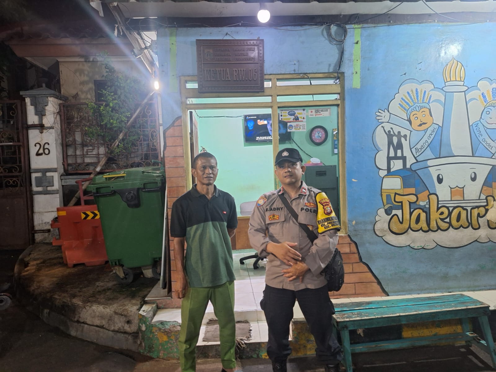 Jakarta Pusat – Dalam rangka menjaga dan menciptakan situasi keamanan dan ketertiban masyarakat (kamtibmas) yang aman dan kondusif, Bhabinkamtibmas Kelurahan Pegangsaan, Aipda H.M. Adhy M.N., melaksanakan patroli dialogis dengan menyambangi Pos Satkamling RW 06 Pegangsaan, Jalan Tambak Ujung, Kecamatan Menteng, Jakarta Pusat, pada malam hari. Rabu (14/1/2026)