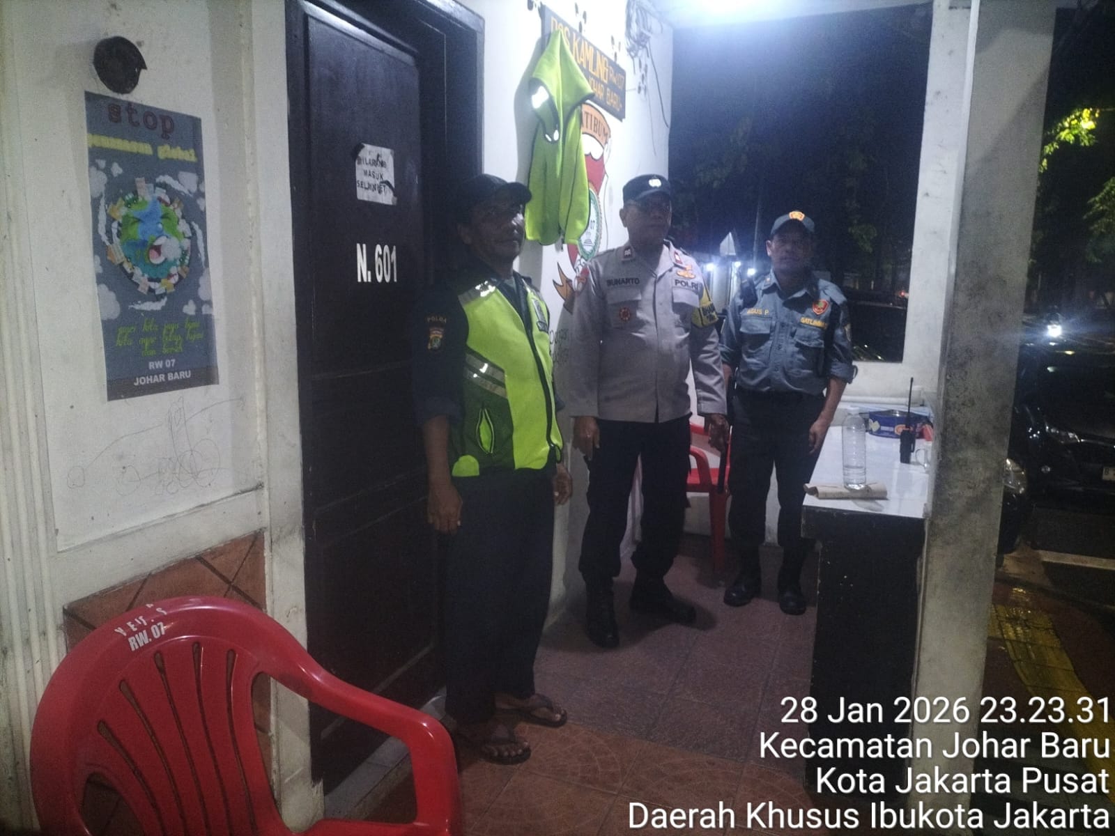 Kegiatan tersebut dilakukan bersama Bapak Agus dan Bapak Iwan selaku awak Satkamling RW 07. Dalam kesempatan itu, petugas melakukan dialog serta bertukar informasi kewilayahan guna meningkatkan deteksi dini terhadap potensi gangguan kamtibmas di lingkungan warga.