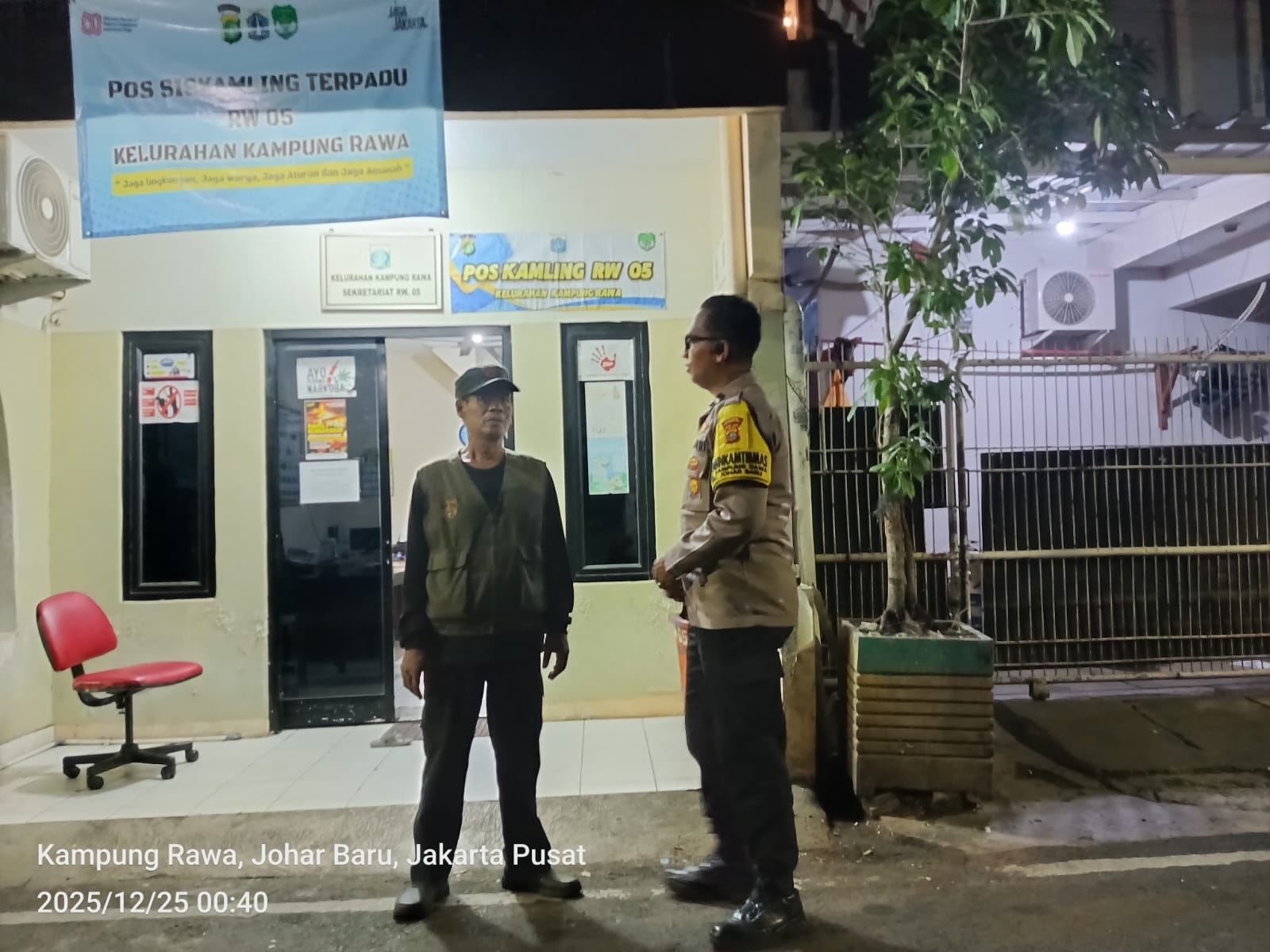 Jakarta Pusat — Dalam rangka menjaga keamanan dan ketertiban masyarakat (kamtibmas), khususnya pada jam-jam rawan dini hari, Bhabinkamtibmas Kelurahan Kampung Rawa Polsek Johar Baru melaksanakan patroli wilayah dan sambang ke Pos Satkamling RW 05, Kamis dini hari, 25 Desember 2025, pukul 00.40 WIB.