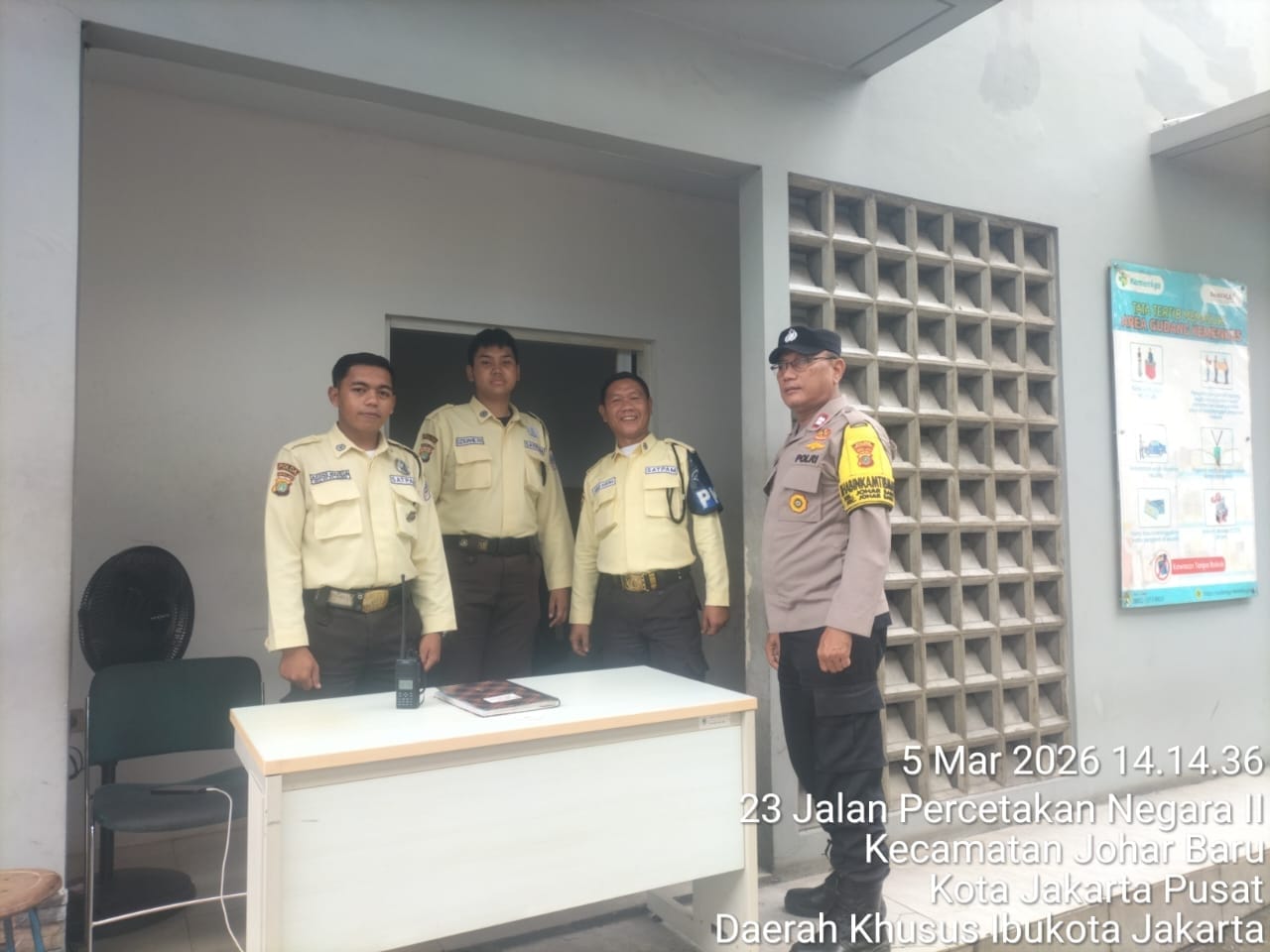 Jakarta Pusat – Dalam rangka menjaga keamanan dan ketertiban masyarakat serta meningkatkan kewaspadaan di objek vital, Bhabinkamtibmas Kelurahan Johar Baru melaksanakan kegiatan sambang dan memberikan himbauan kamtibmas kepada petugas Satuan Pengamanan (Satpam) di area Gudang Kementerian Kesehatan RI, Kamis (5/3/2026).