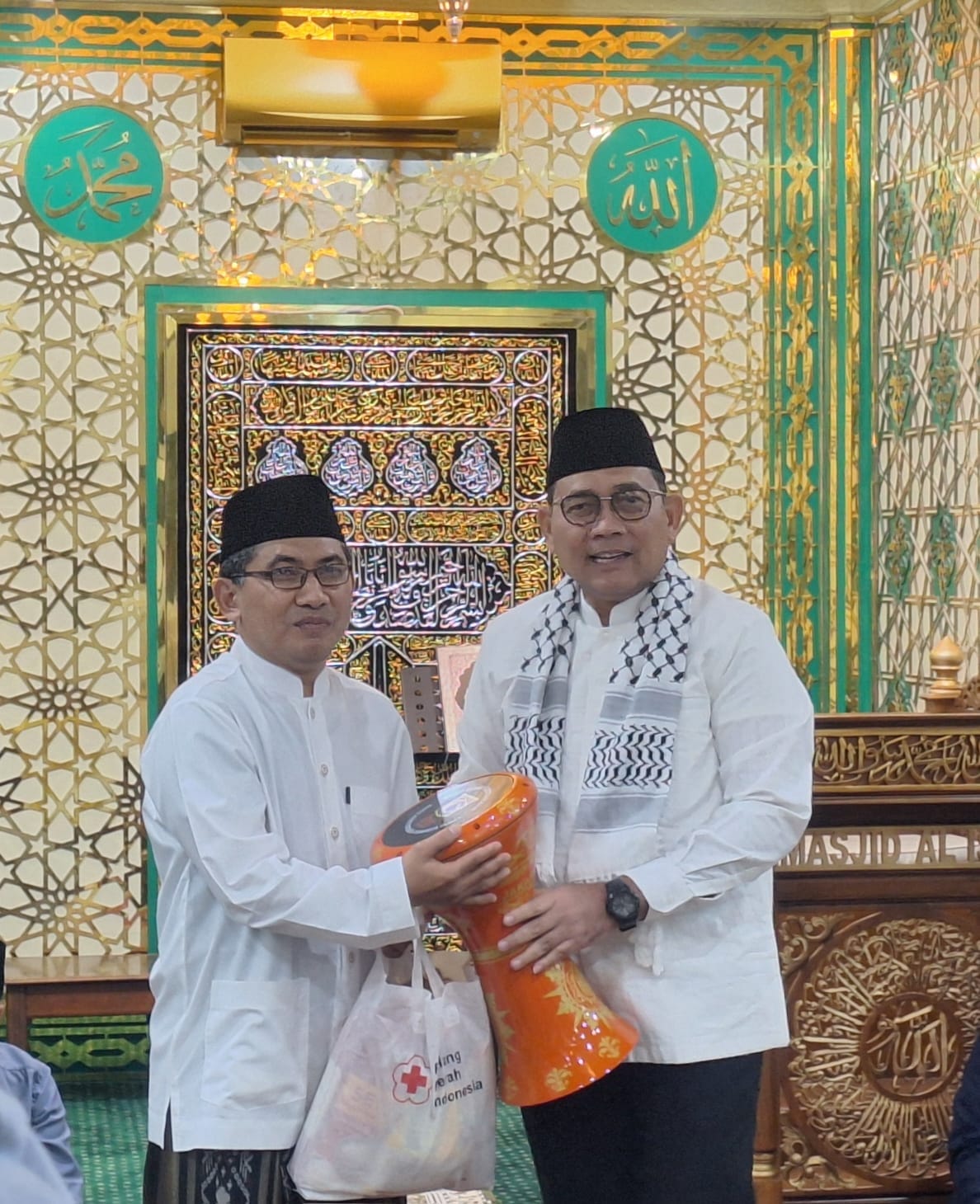 Pukul 17.49 WIB, Wali Kota menyerahkan bantuan berupa alat marawis dan dana sebesar Rp15.000.000 kepada Ketua DKM Masjid Al-Isro sebagai bentuk dukungan terhadap kegiatan keagamaan dan pembinaan generasi muda.