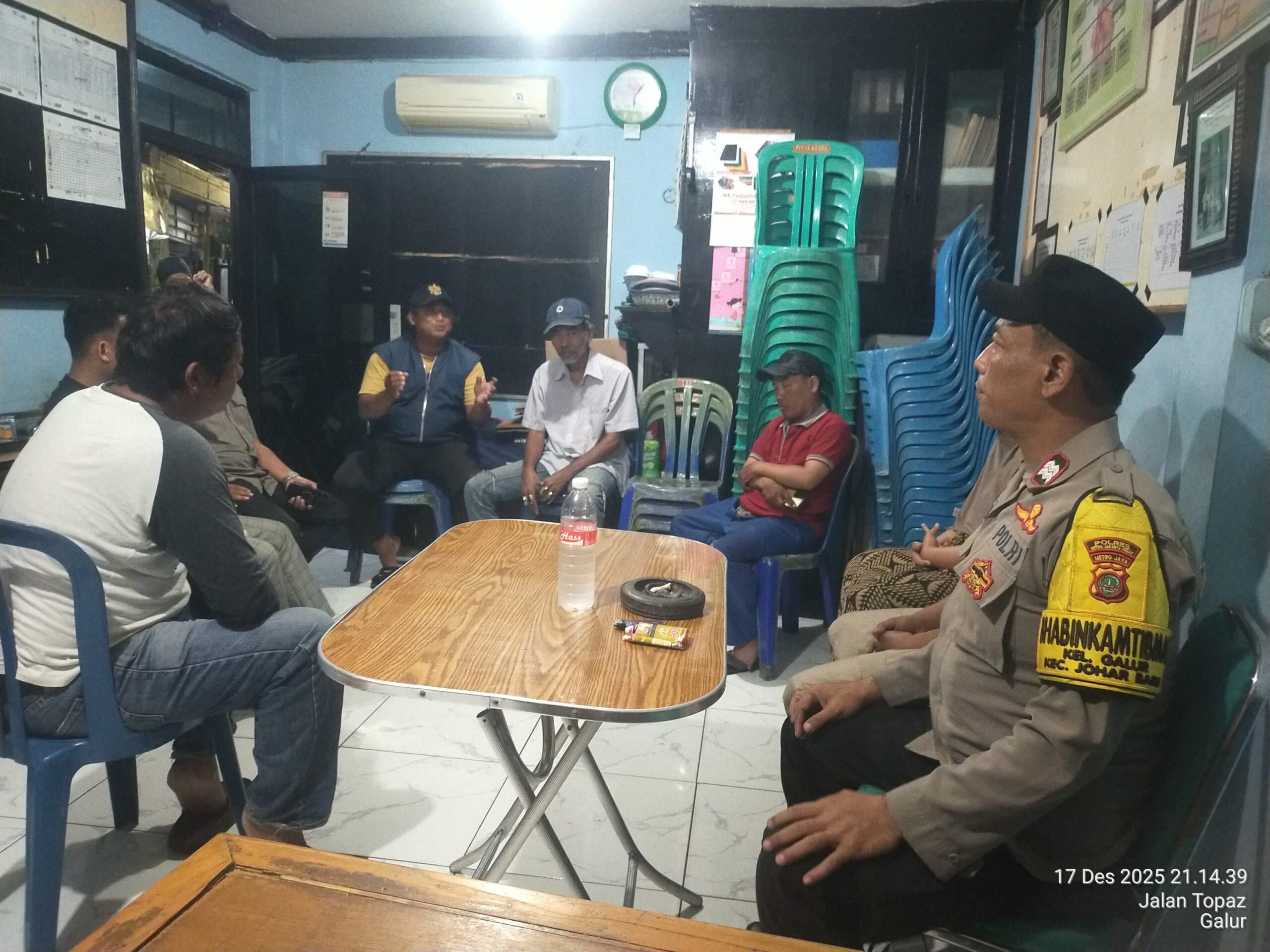 Jakarta Pusat — Dalam upaya mencegah tawuran dan tindak kriminalitas di lingkungan masyarakat, Bhabinkamtibmas Kelurahan Galur Polsek Johar Baru melaksanakan kegiatan sambang Pos Kamling RW 03, Rabu (17/12/2025) malam.