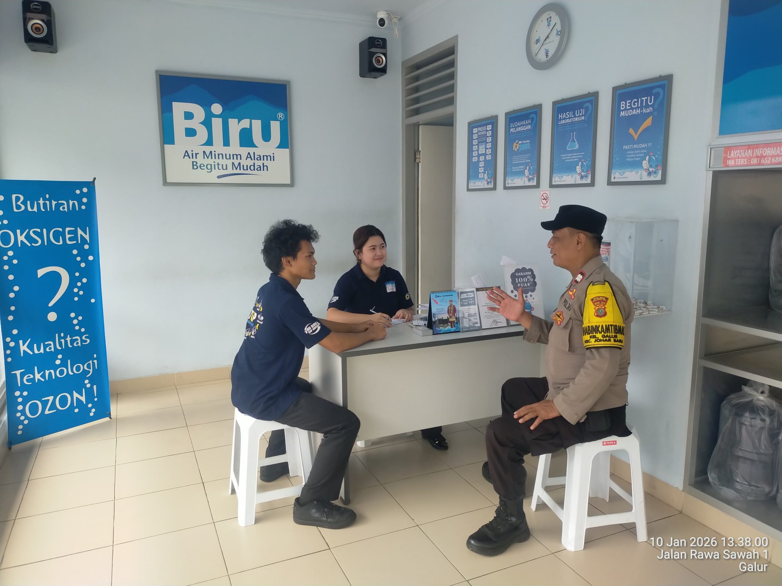 Kegiatan tersebut berlangsung pada pukul 15.00 WIB di Agen Air Biru yang berlokasi di Jalan Galur Selatan RT 011/RW 01 Kelurahan Galur. Dalam kegiatan ini, Aiptu Baktiar berdialog langsung dengan Sdri. Sabilla selaku karyawati Agen Air Biru bersama karyawan lainnya, guna menyampaikan imbauan kamtibmas serta menyerap informasi terkait kondisi keamanan di lingkungan sekitar.