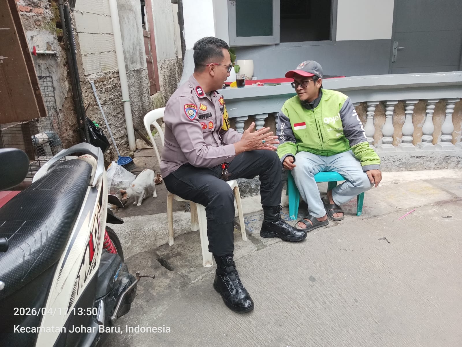 Dalam kegiatan tersebut, Aiptu Ikhwan berdialog langsung dengan Koordinator Lapangan (Korlap) Ojol Jaga Jakarta Kecamatan Johar Baru, yakni Pak Imadudin. Melalui komunikasi yang hangat dan dialogis, petugas mengajak seluruh elemen masyarakat, khususnya komunitas ojol, untuk bersama-sama menjaga kondusifitas lingkungan.
