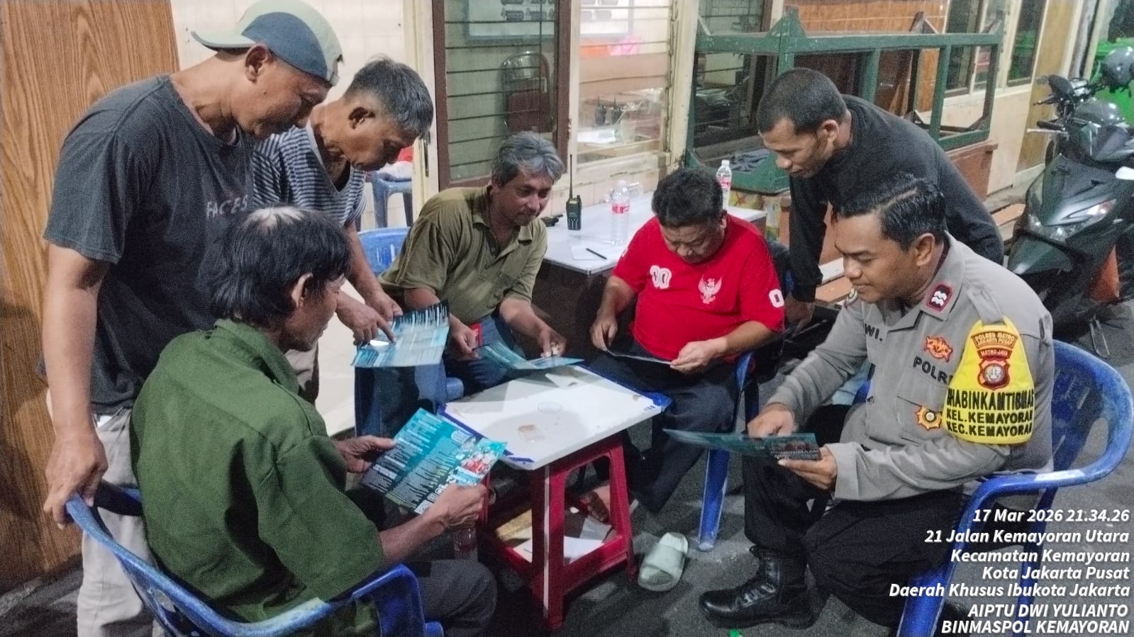 Kegiatan sosialisasi tersebut dilaksanakan pada Selasa (17/3/2026) malam di Kantor Kelurahan Kemayoran dan Sekretariat RW 07, Jakarta Pusat. Dalam kegiatan ini, Bhabinkamtibmas Kelurahan Kemayoran, Aiptu Dwi Yulianto, membagikan brosur sekaligus memberikan penjelasan langsung kepada warga terkait mekanisme, persyaratan, serta tahapan seleksi penerimaan anggota Polri.