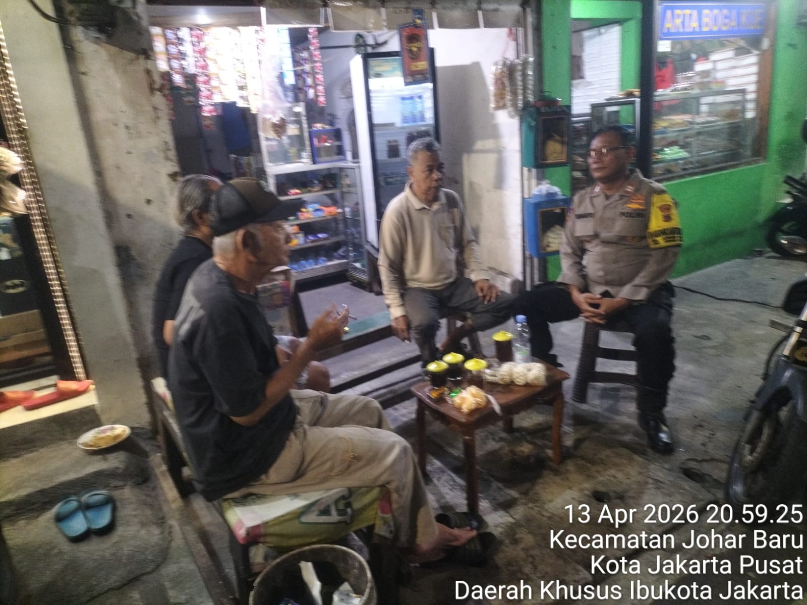 Kegiatan tersebut dilaksanakan pada Senin, 13 April 2026 pukul 21.00 WIB di Jl. Johar Baru V RW 11, dengan pelaksana Aiptu Sunarto selaku Bhabinkamtibmas Kelurahan Johar Baru. Dalam kegiatan tersebut, petugas melakukan sambang dan dialogis bersama Bapak Ade selaku Katibum RW 11 serta Bapak A. Rahman selaku Ketua RW 11.