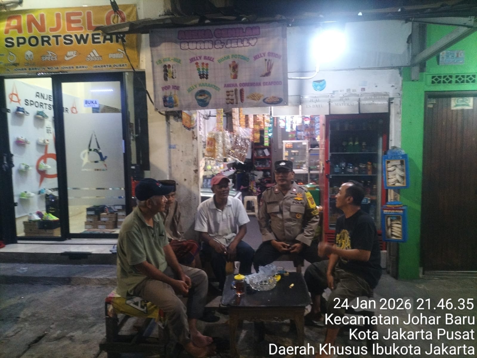 Jakarta Pusat — Bhabinkamtibmas Kelurahan Johar Baru, Aiptu Sunarto, melakukan sambang door to door di RW 11, Kelurahan Johar Baru, Kecamatan Johar Baru. Kegiatan ini bagian dari program cooling system Polsek Johar Baru untuk memastikan lingkungan aman dan kondusif. Sabtu malam (24/1/2026) pukul 20.50 WIB.