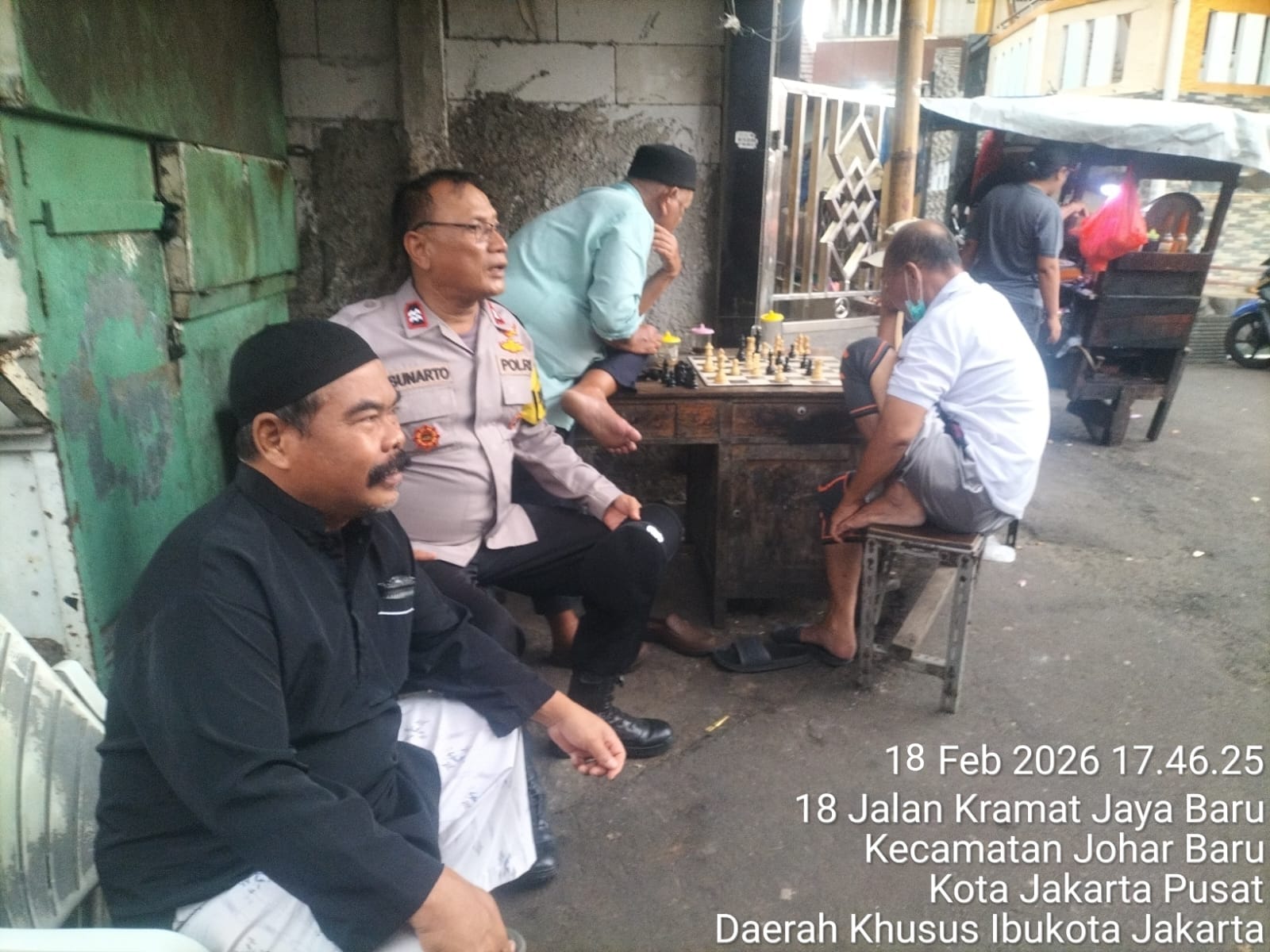 Jakarta Pusat – Dalam upaya menjaga situasi keamanan dan ketertiban masyarakat (kamtibmas) tetap kondusif, Bhabinkamtibmas Kelurahan Johar Baru melaksanakan patroli dan sambang warga di Jl. Kramat Jaya Baru IV A RW 08, Kelurahan Johar Baru, Kecamatan Johar Baru, Jakarta Pusat, pada Rabu, 18 Februari 2026 pukul 17.50 WIB.