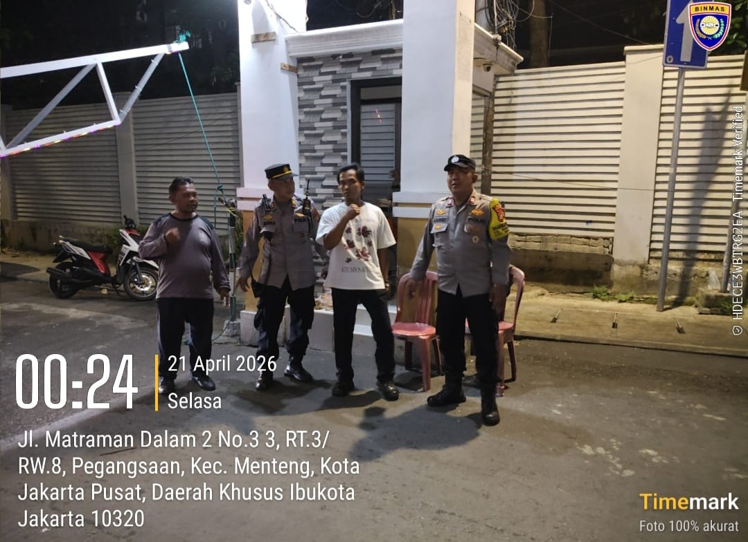 Jakarta Pusat – Dalam rangka memperkuat keamanan dan ketertiban masyarakat (kamtibmas), jajaran Polsek Metro Menteng terus menggencarkan kegiatan sambang ke lingkungan warga. Kali ini, Kanit Binmas Polsek Metro Menteng AKP Irawan Junaedi bersama Bhabinkamtibmas Gondangdia Aiptu Kamidi melaksanakan sambang kamtibmas di Pos Satkamling Jalan Matraman Dalam II RW 08, Kelurahan Pegangsaan, Kecamatan Menteng, Jakarta Pusat. Selasa (21/4/2026)