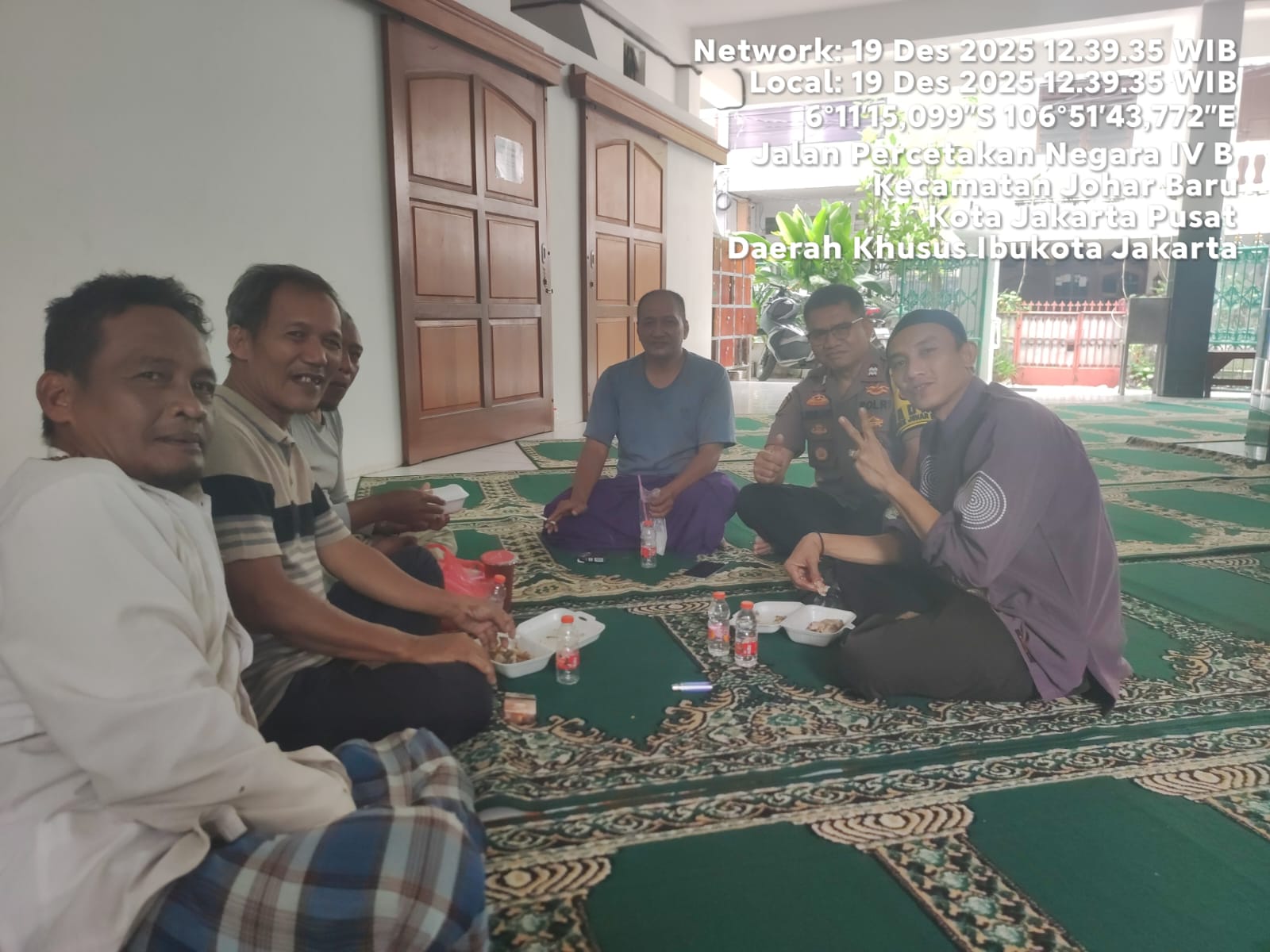 Jakarta Pusat — Dalam rangka mempererat silaturahmi serta menjaga situasi keamanan dan ketertiban masyarakat (kamtibmas), Kapolsubsektor Kayu Awet Kelurahan Johar Baru, Aiptu Lukas Indrijanto, melaksanakan Sholat Jumat berjamaah bersama warga di Masjid Izul Islam, RW 009, Kelurahan Johar Baru, Kecamatan Johar Baru, Jakarta Pusat, Jumat (19/12/2025) pukul 11.30 WIB.