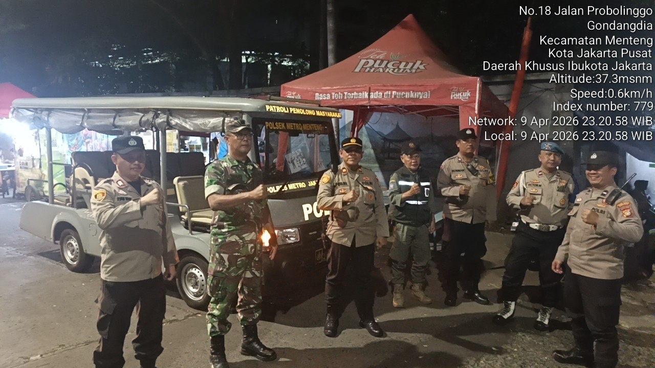 Jakarta Pusat – Upaya menjaga keamanan wilayah terus dilakukan jajaran Polsek Metro Menteng bersama unsur Tiga Pilar melalui patroli malam terpadu di kawasan rawan. Dalam rangka program Jaga Jakarta, patroli kali ini menyasar perbatasan Kwitang–Kalipasir, Menteng, Jakarta Pusat, guna mengantisipasi potensi gangguan keamanan dan ketertiban masyarakat. Jumat (10/4/2026)