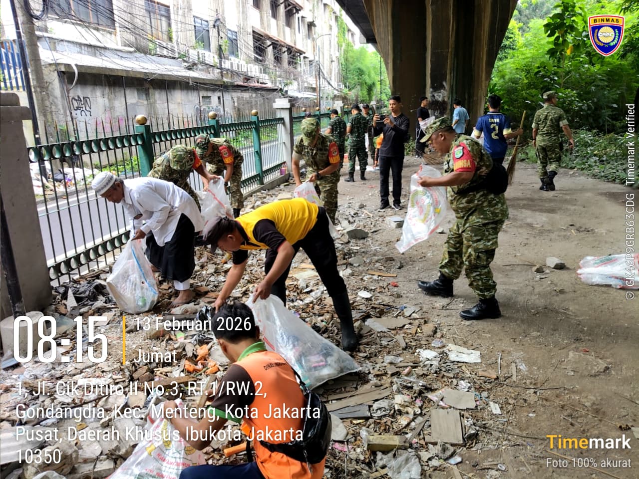 Jakarta Pusat – Dalam rangka meningkatkan kebersihan lingkungan sekaligus menindaklanjuti arahan Prabowo Subianto terkait penanganan sampah dan antisipasi banjir, Bhabinkamtibmas Kelurahan Gondangdia Aiptu Kamidi bersama unsur tiga pilar Kecamatan Menteng mengikuti kegiatan kerja bakti serentak Tahun 2026. Kegiatan tersebut dipusatkan di bawah rel perbatasan Cikini dan Gondangdia, Menteng, Jakarta Pusat. Jumat (13/2/2026)