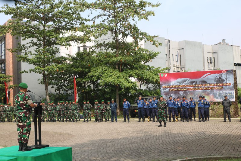 Danrem 052/Wijayakrama Brigjen TNI Zulhadrie S. Mara, M.Han., memimpin Apel Kesiapsiagaan dan Gelar Pasukan dalam rangka menghadapi potensi konflik sosial. Kegiatan ini dilaksanakan di Lapangan Alam Sutera, Serpong Utara, Kabupaten Tangerang, Senin (29/9/2025).