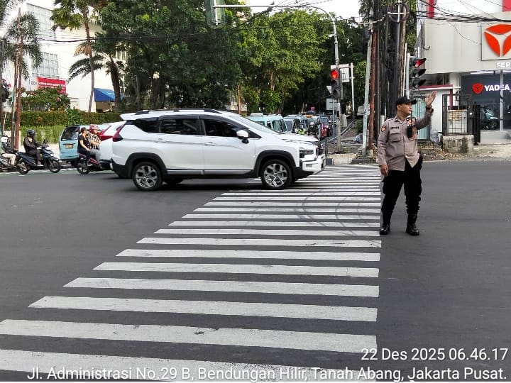 Jakarta Pusat —Dalam rangka menjaga kelancaran dan ketertiban lalu lintas, Polsek Metro Tanah Abang melaksanakan kegiatan pengaturan arus lalu lintas di kawasan traffic light (TL) Penjernihan Raya, Tanah Abang, Jakarta Pusat. Senin (22/12/2025) pagi.