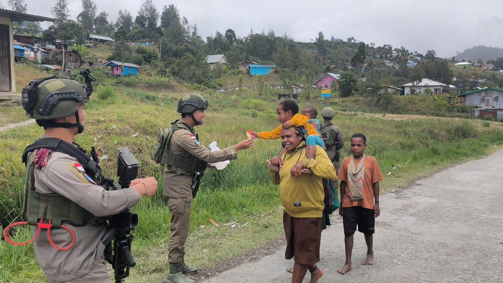 Di tengah patroli dialogis tersebut, personel juga berhenti untuk menyapa warga, memeriksa kondisi kesehatan, serta memberikan obat dan vitamin bagi masyarakat yang membutuhkan. Anak-anak, mama-mama, hingga para lansia tampak antusias menyambut kehadiran petugas yang datang berjalan kaki menembus medan yang tidak mudah.
