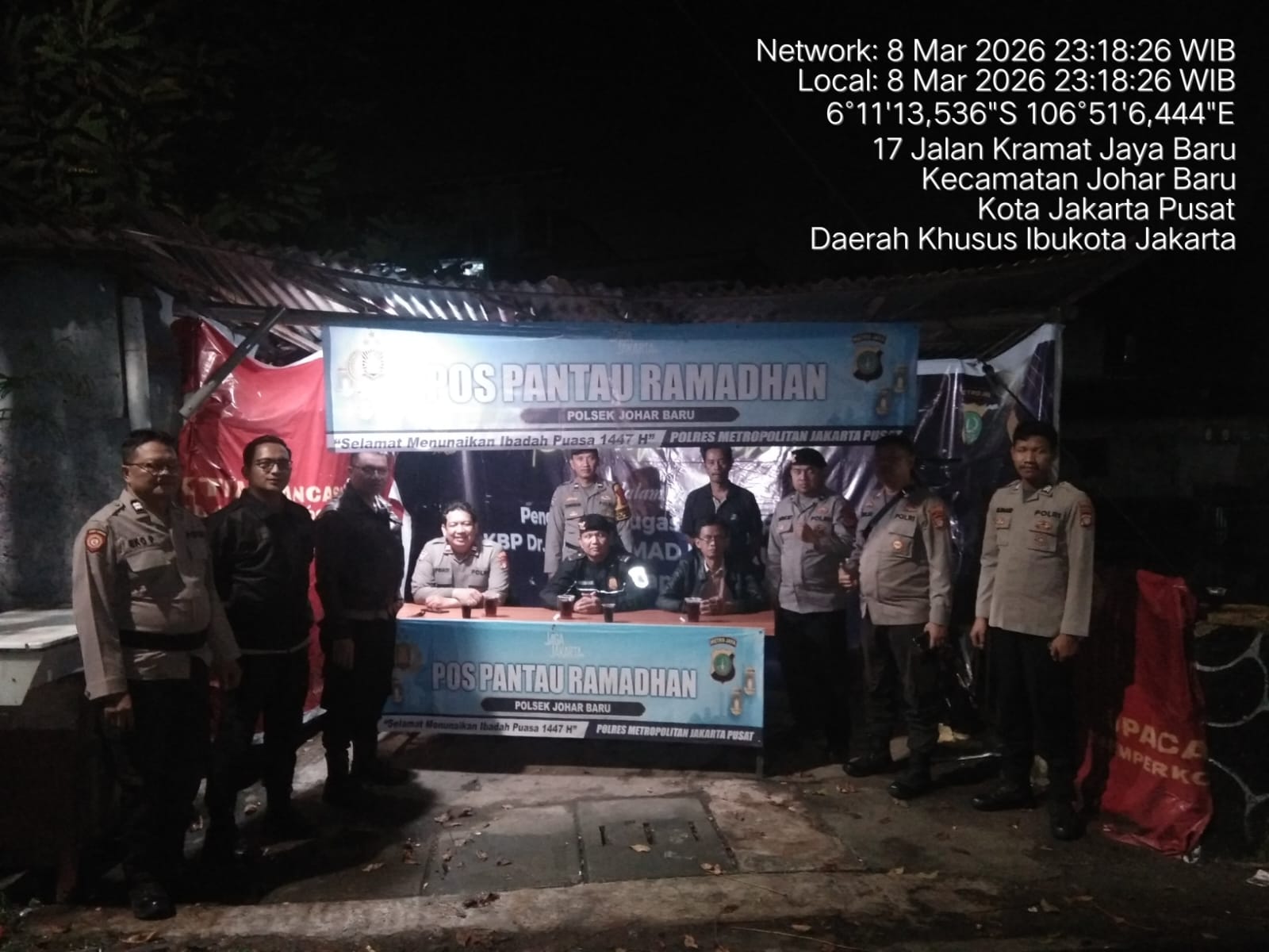 Jakarta Pusat – Memasuki malam ke-20 bulan suci Ramadhan 1447 H, jajaran Polsek Johar Baru meningkatkan kegiatan pelayanan dan pengamanan melalui Pos Pantau Ramadhan di sejumlah titik wilayah Kecamatan Johar Baru, Jakarta Pusat, Minggu malam (8/3/2026).