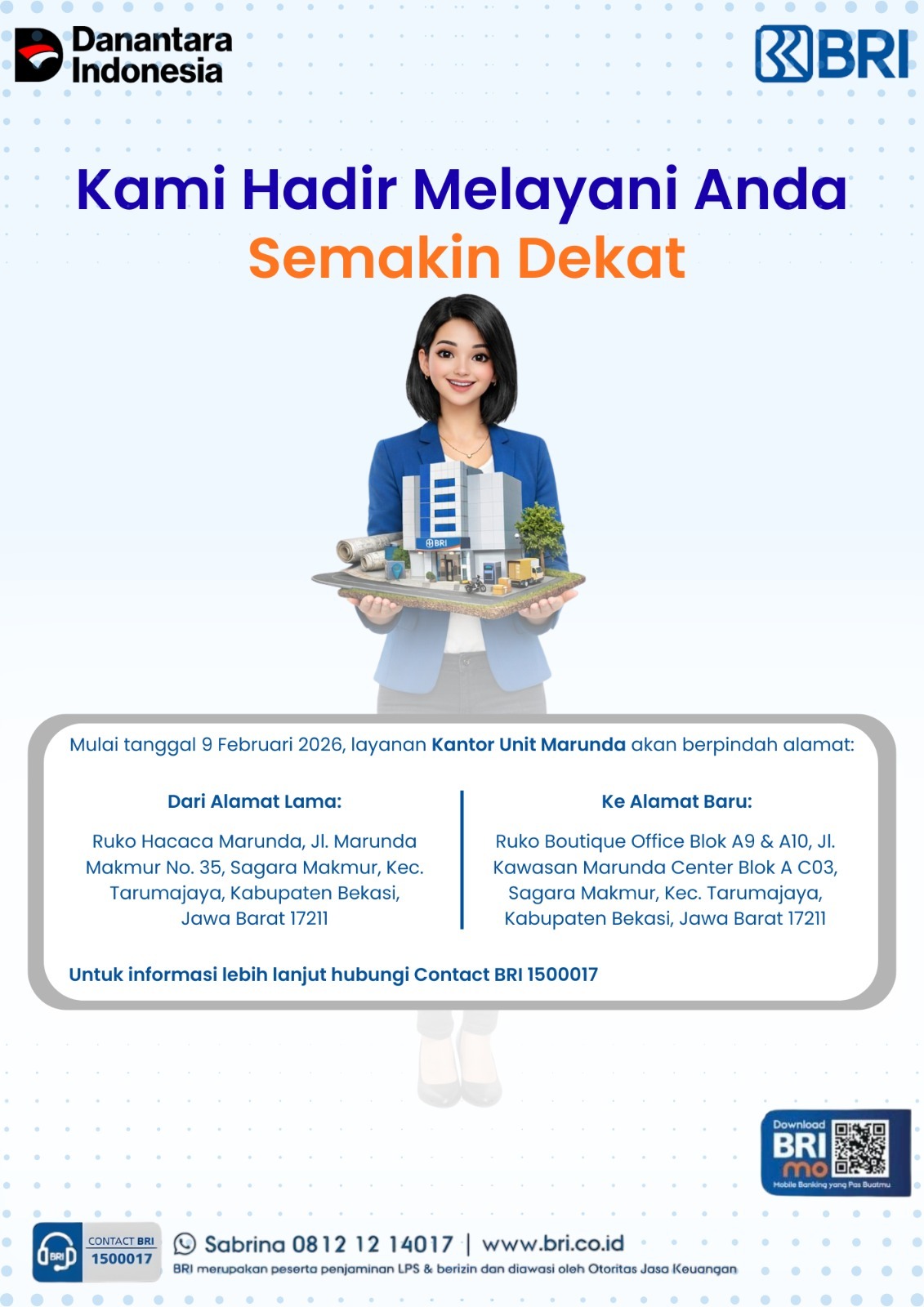 Marunda, KAB. Bekasi, – BRI mengumumkan perpindahan layanan Kantor Unit Marunda ke alamat baru mulai 09 Februari 2026. Relokasi dilakukan untuk memastikan layanan perbankan lebih mudah dijangkau dan operasional semakin terpusat di kantor yang lebih layak.