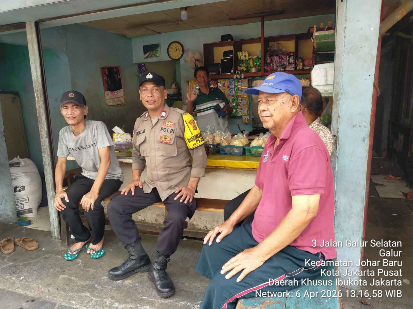 Kegiatan berlangsung di sebuah warung kopi di Jalan Galur Selatan RT 02/01, di mana Aiptu Baktiar bertemu dan berdialog langsung dengan Ketua RT setempat, Syahril, bersama warga sekitar. Melalui pendekatan cooling system, suasana santai dimanfaatkan untuk mempererat komunikasi sekaligus menyampaikan pesan-pesan kamtibmas.