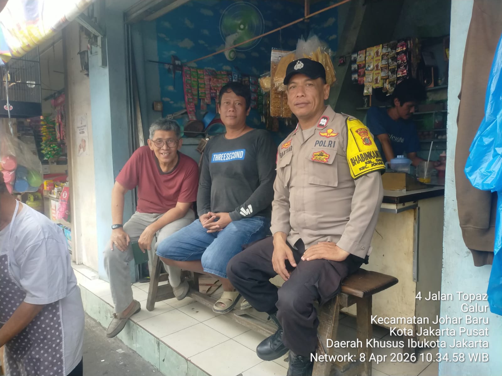 Jakarta Pusat – Dalam rangka menjaga situasi keamanan dan ketertiban masyarakat, Bhabinkamtibmas Kelurahan Galur Aiptu Baktiar melaksanakan patroli dan sambang warga di wilayah Kelurahan Galur, Kecamatan Johar Baru, Jakarta Pusat, Rabu (8/4/2026) pukul 11.30 WIB.