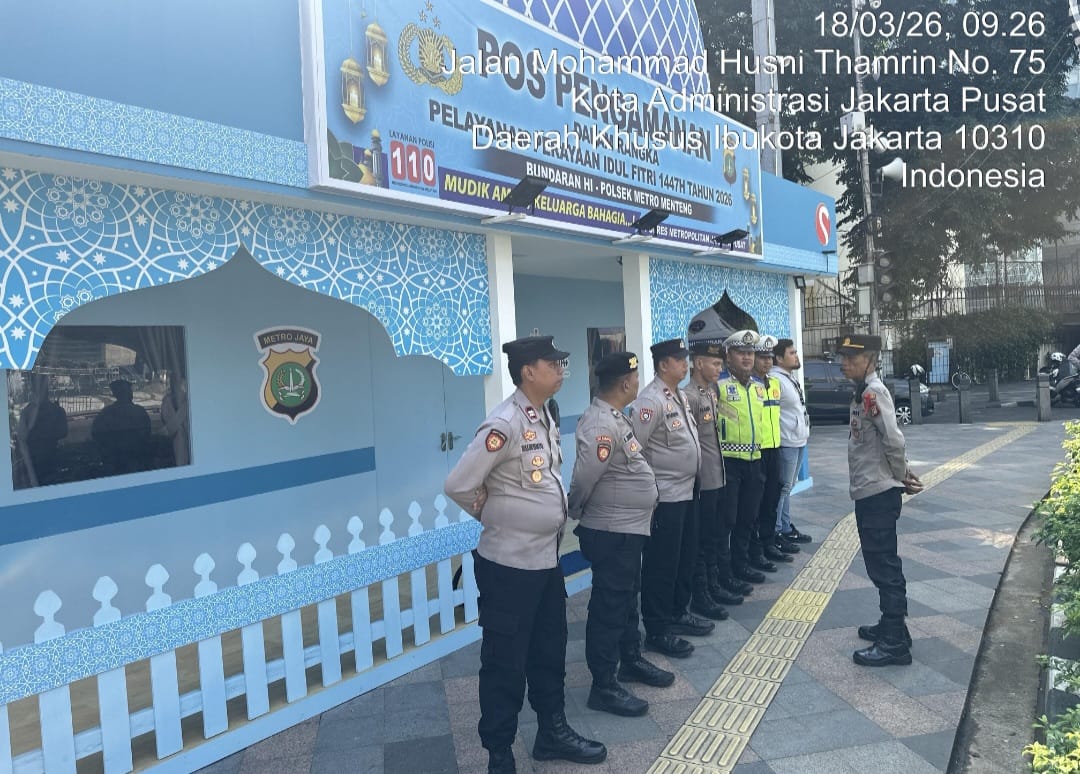 Jakarta Pusat – Dalam rangka menciptakan situasi keamanan dan ketertiban masyarakat yang kondusif selama perayaan Hari Raya Idulfitri, Polsek Metro Menteng melaksanakan pengamanan terpadu melalui Pos Pengamanan (Pospam) Operasi Ketupat Jaya 2026 di kawasan Bundaran Hotel Indonesia (HI), Jalan MH Thamrin, Menteng, Jakarta Pusat. Kegiatan ini dipimpin langsung oleh Kapospam IPtu Agung Sukiswo dengan melibatkan sebanyak 11 personel yang disiagakan di titik strategis pusat ibu kota tersebut. Rabu (18/3/2026)