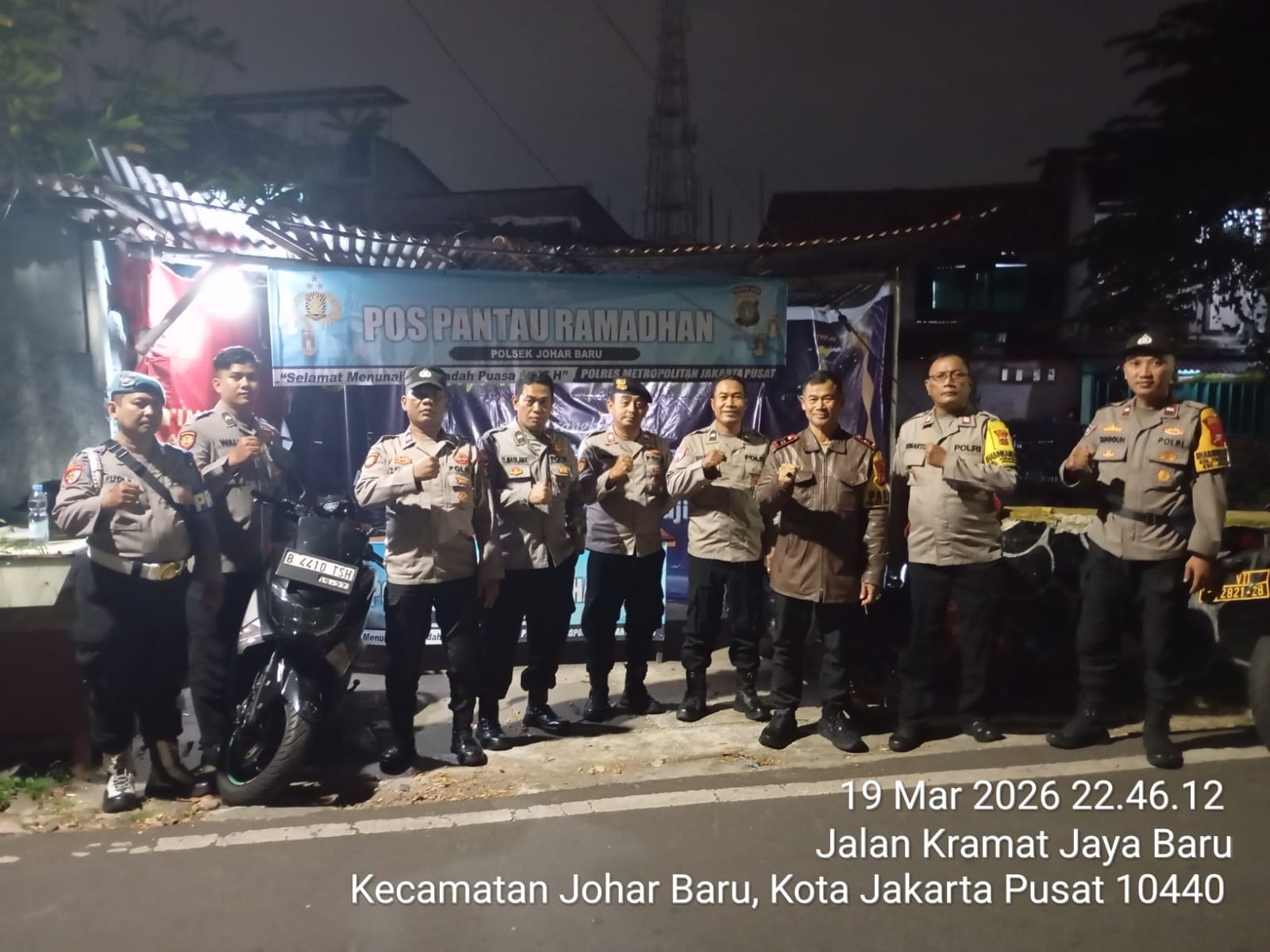 Kegiatan tersebut dilaksanakan pada Kamis (19/3/2026) pukul 22.50 WIB di Pos Pantau Ramadhan 1447 H (Pos Kawi-Kawi) yang berlokasi di Jalan Percetakan Negara I, Kelurahan Johar Baru, Jakarta Pusat. Tim Patroli Tiga Pilar dipimpin oleh Kanit Binmas selaku Perwira Pengendali (Padal) Iptu Darwin Efendi, didampingi Kapolsubsektor Galur, bersama personel Polsek Johar Baru.