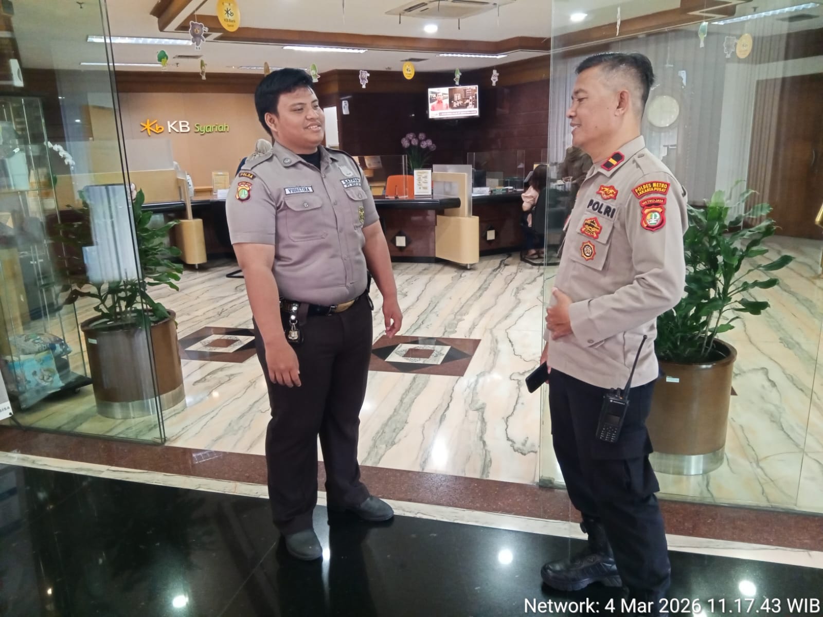 Petugas Unit Samapta dari Polsek Senen melaksanakan patroli dialogis serta sambang ke sejumlah objek vital, bank, dan pusat perbelanjaan di wilayah hukum Senen pada Rabu (4/3). Kegiatan ini dilakukan untuk menjaga situasi keamanan dan ketertiban masyarakat selama bulan Ramadan 1447 H.