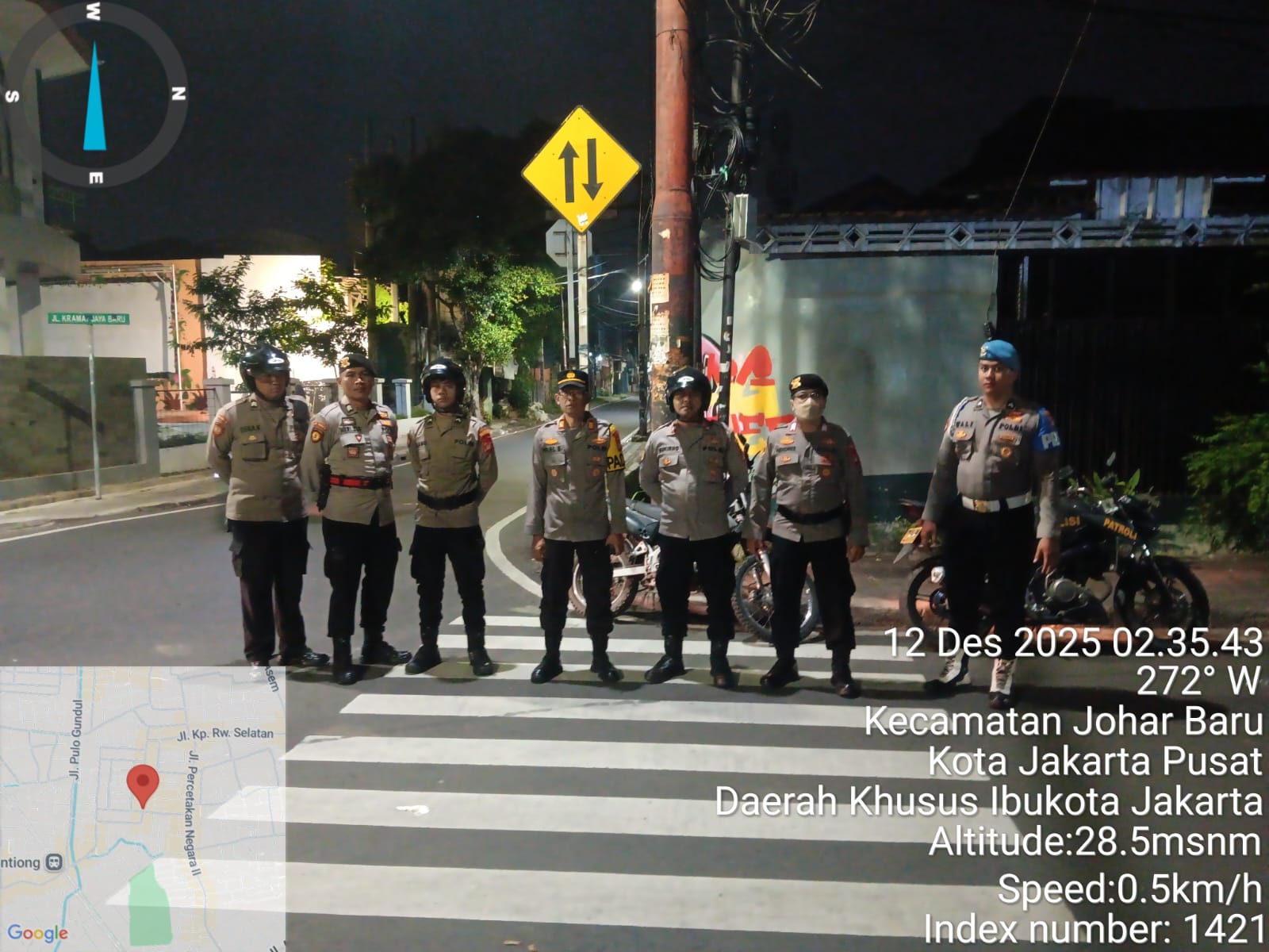 Jakarta Pusat — Dalam rangka menjaga keamanan dan ketertiban masyarakat pada waktu rawan, jajaran Polsek Johar Baru melaksanakan Patroli Cipta Kondisi pada Jumat (12/12/2025) pukul 02.30 WIB. Kegiatan ini dipimpin oleh Padal (201) AKP Hilal Sugiharto, Kanit Intelkam, dengan melibatkan 10 personel Polsek Johar Baru.