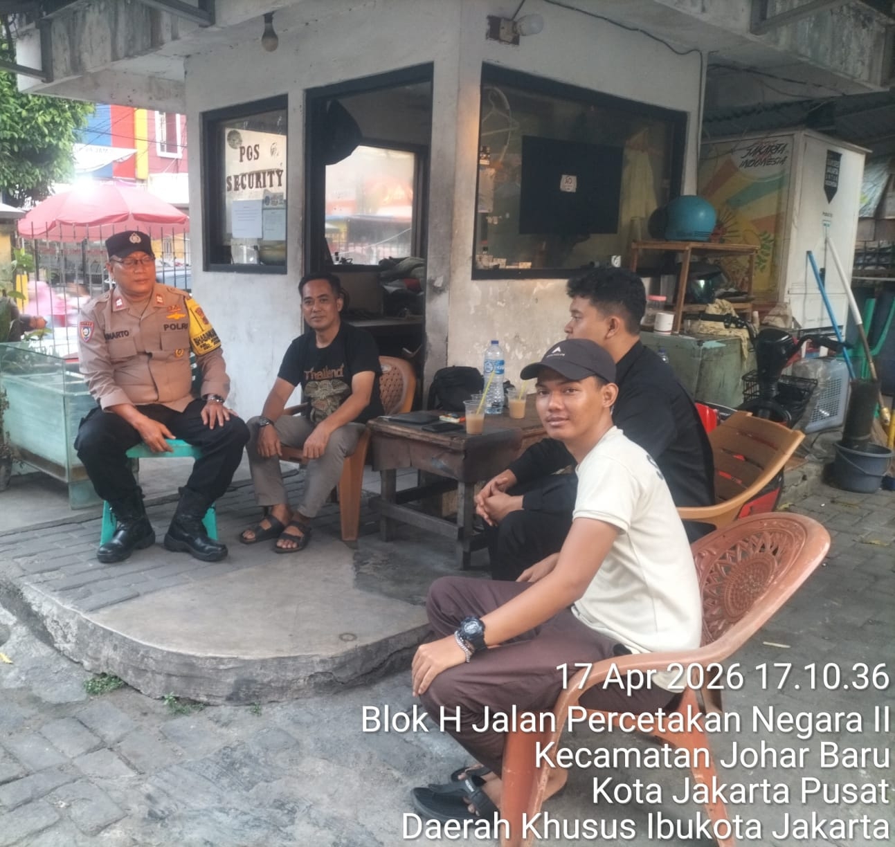 Kegiatan ini dilakukan oleh Bhabinkamtibmas Kelurahan Johar Baru, Aiptu Sunarto, yang bertemu langsung dengan pihak keamanan gedung, yakni Sdr. Niko dan Sdr. Rafli. Dalam kesempatan tersebut, petugas menyampaikan imbauan kamtibmas agar seluruh pihak terus meningkatkan kewaspadaan terhadap potensi gangguan keamanan di lingkungan sekitar.