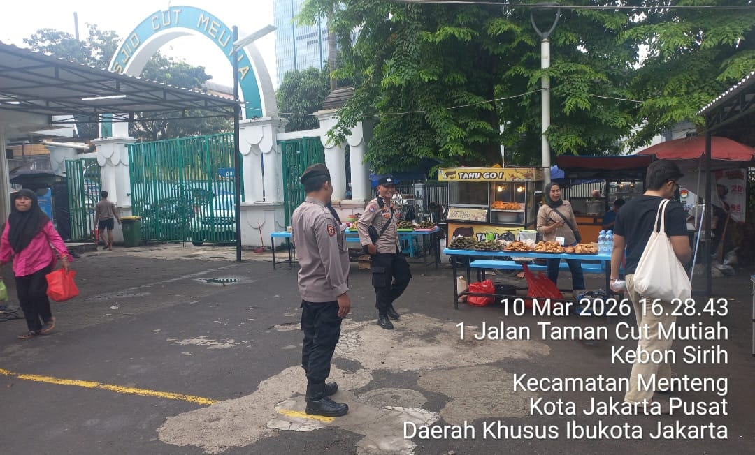 Jakarta Pusat – Dalam rangka memberikan rasa aman dan nyaman kepada masyarakat selama bulan suci Ramadhan, jajaran Polsek Metro Menteng melaksanakan kegiatan pelayanan serta pengamanan di kawasan pasar tumpah Ramadhan yang berada di sekitar Masjid Cut Mutia, Jalan Taman Cut Mutia, Cikini, Menteng, Jakarta Pusat. Selasa (10/3/2026)