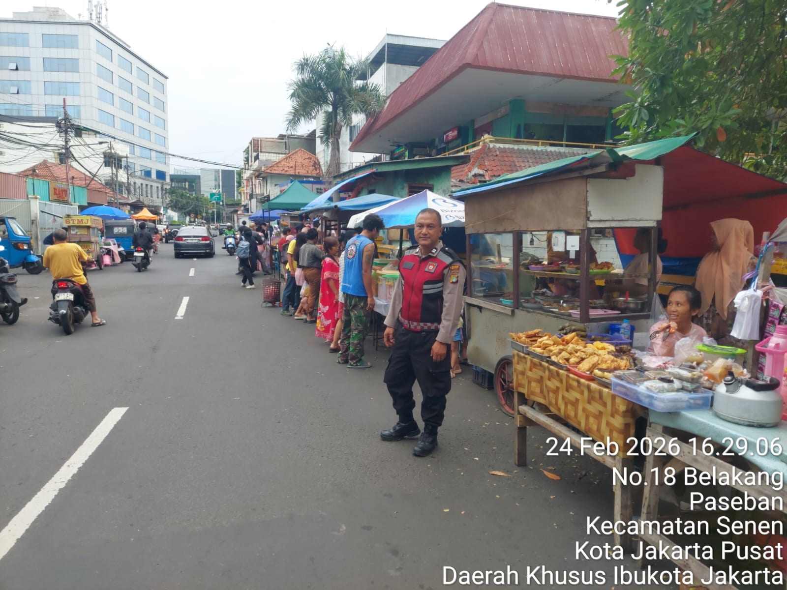Petugas kepolisian melakukan pengecekan sekaligus pengamanan kegiatan pasar tumpah di wilayah Kelurahan Paseban, Kecamatan Senen, Jakarta Pusat, Selasa (24/2/2026) sore. Kegiatan ini dilakukan untuk memastikan aktivitas masyarakat berjalan aman dan tertib.