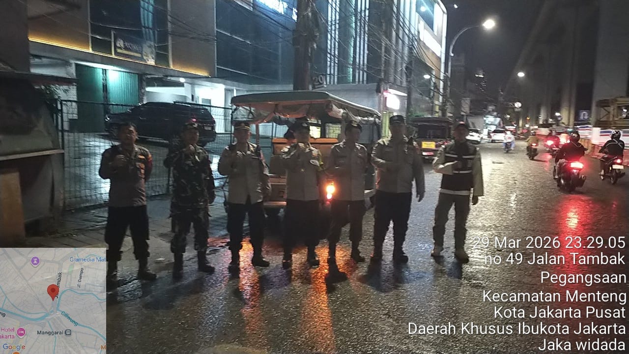 Jakarta Pusat – Dalam rangka menjaga stabilitas keamanan dan ketertiban masyarakat (kamtibmas), jajaran Tiga Pilar Kecamatan Menteng menggelar patroli wilayah dengan fokus pemantauan di kawasan perbatasan Tambak–Manggarai, Menteng, Jakarta Pusat. Wilayah ini menjadi salah satu titik rawan yang kerap berpotensi terjadi tawuran antarwarga. Senin (30/3/2026)