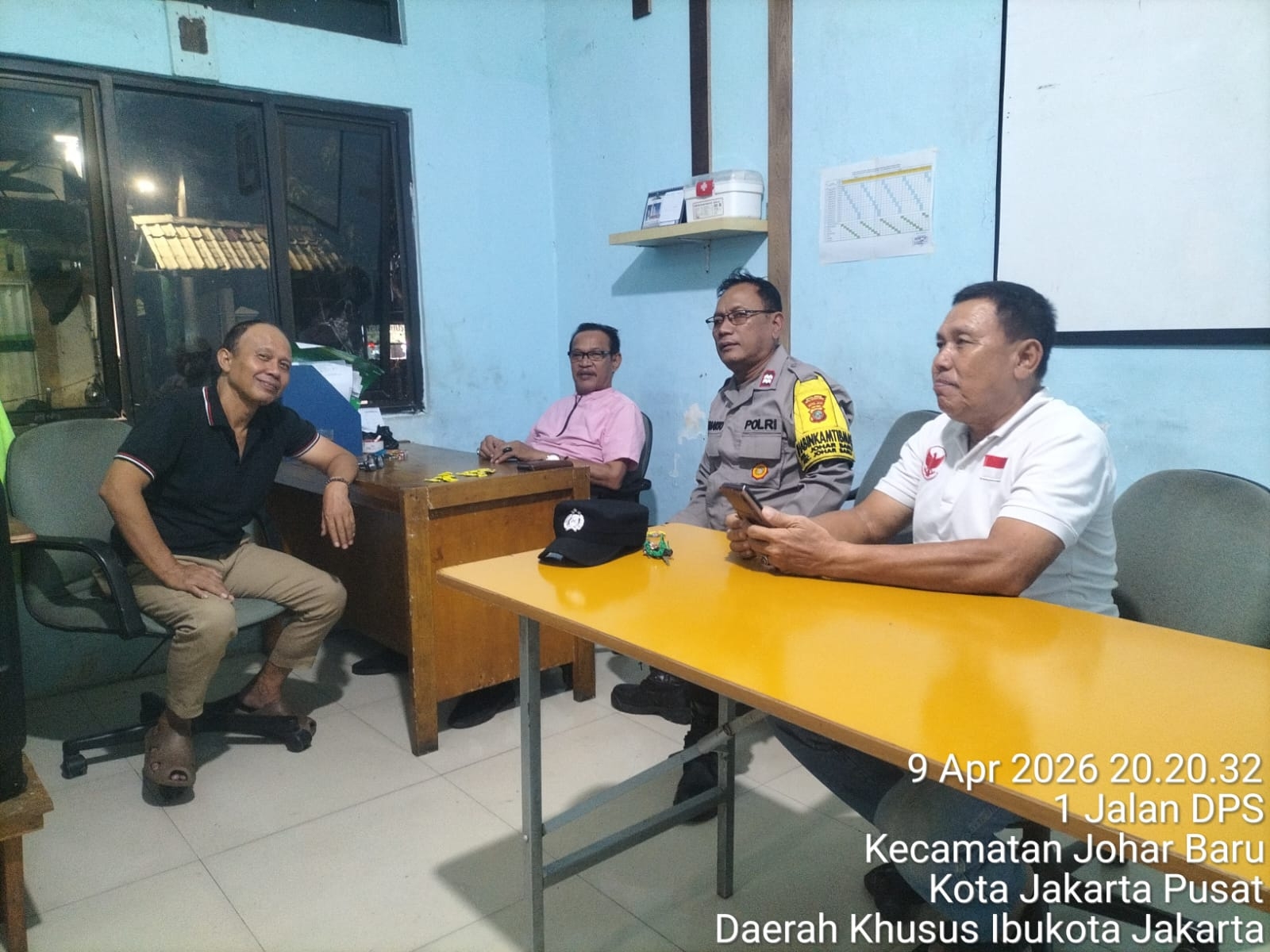 Jakarta Pusat – Dalam upaya menjaga keamanan dan ketertiban masyarakat, Bhabinkamtibmas Kelurahan Johar Baru Aiptu Sunarto melaksanakan patroli wilayah sekaligus sambang ke Sekretariat RW 06, Jalan Percetakan Negara II, Kamis (9/4/2026) pukul 20.30 WIB.
