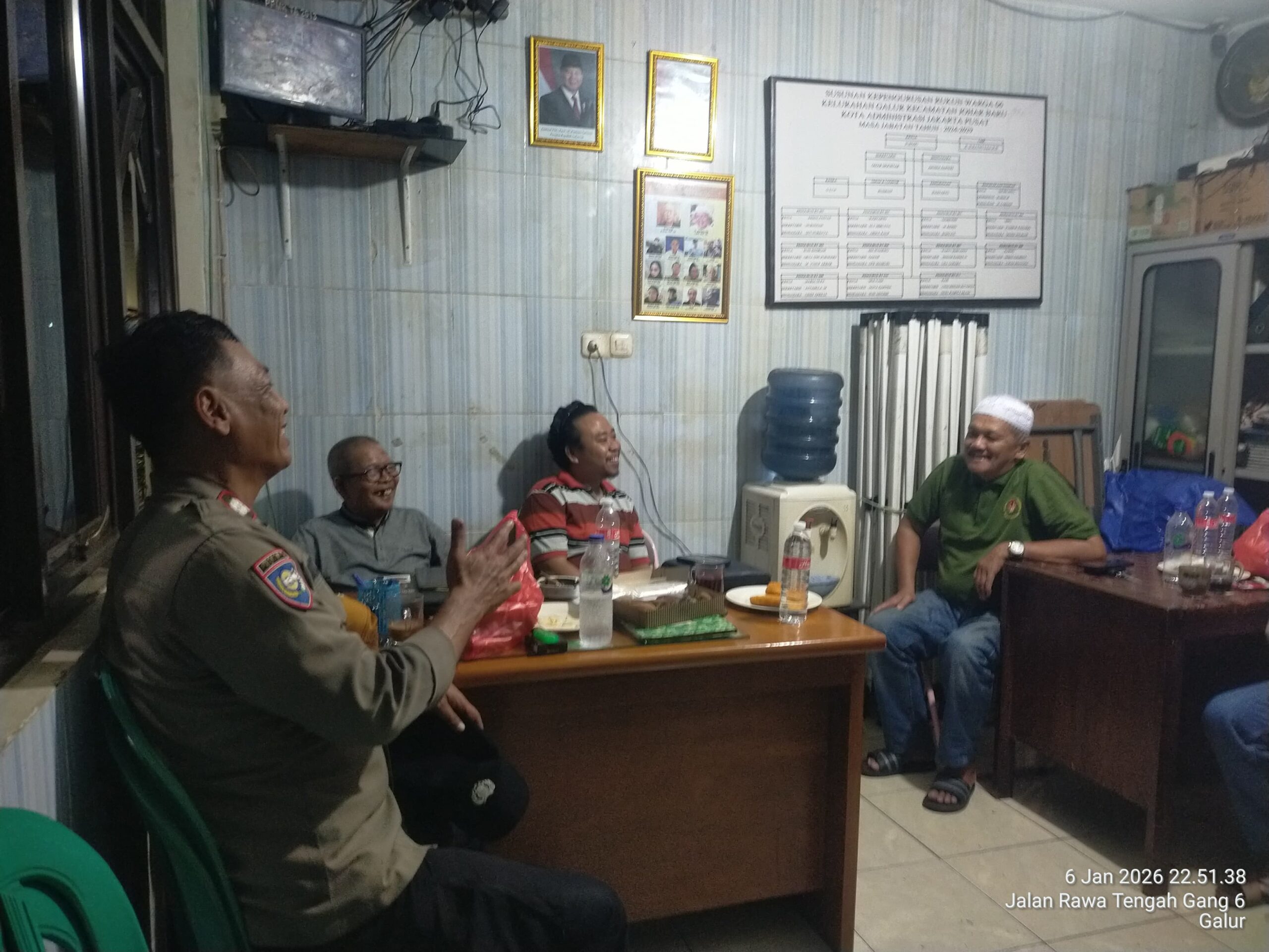 Jakarta Pusat – Upaya menjaga keamanan dan ketertiban masyarakat (kamtibmas) terus dilakukan jajaran Polsek Johar Baru dengan menggandeng peran aktif warga. Pada Selasa (6/1/2026) malam, Bhabinkamtibmas Kelurahan Galur melaksanakan sambang dan cooling system di Pos Kamling RW 06, Jalan Rawa Tengah, Kelurahan Galur, Kecamatan Johar Baru, Jakarta Pusat.