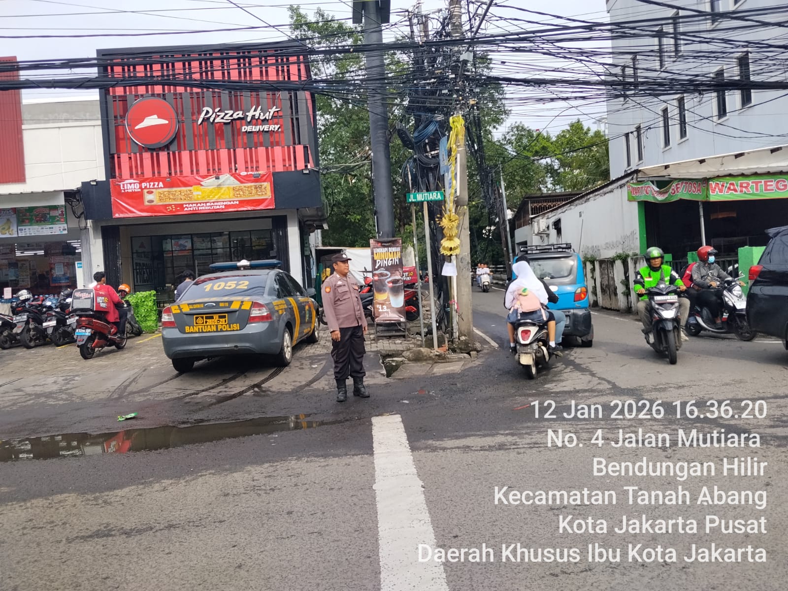 Jakarta Pusat — Dalam rangka memberikan pelayanan kepada masyarakat serta menjaga kelancaran arus lalu lintas pada sore hari, personel Polsek Metro Tanah Abang melaksanakan kegiatan pengaturan lalu lintas dan strong point di pertigaan Jalan Mutiara, Bendungan Hilir, Tanah Abang, Jakarta Pusat. Senin, (12/1/2026). sore hari.