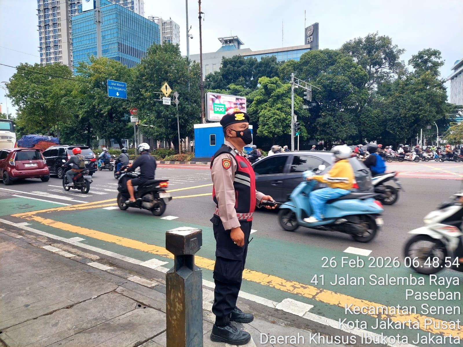 Jajaran Samapta dari Polsek Senen melaksanakan kegiatan pengaturan lalu lintas (gatur lalin) pada Kamis pagi, 26 Februari 2026. Kegiatan ini dilakukan di sejumlah titik rawan kepadatan di wilayah Kecamatan Senen, Jakarta Pusat.