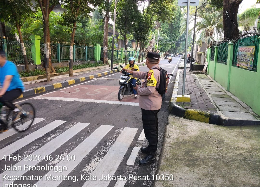 Jakarta Pusat – Wujud nyata kehadiran Polri di tengah masyarakat terus ditunjukkan melalui kegiatan pelayanan pagi hari bertajuk Police Go to School. Bhabinkamtibmas Kelurahan Gondangdia, Aiptu Kamidi, melaksanakan pemantauan langsung aktivitas murid masuk sekolah di SD Negeri Gondangdia 03 yang berlokasi di Jalan Probolinggo, Kelurahan Gondangdia, Kecamatan Menteng, Jakarta Pusat, pada pagi hari. Rabu (4/2/2026)