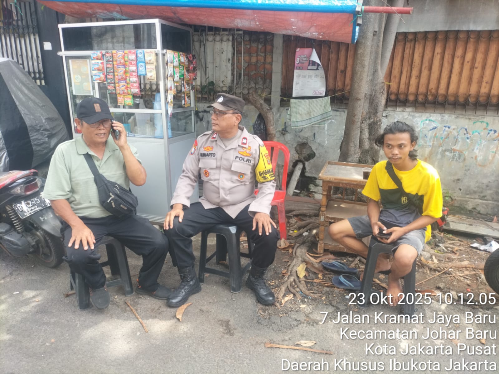 Jakarta Pusat – Dalam rangka menjaga keamanan dan ketertiban masyarakat, Bhabinkamtibmas Kelurahan Johar Baru, Aiptu Sunarto, melaksanakan patroli dialogis dan sambang warga di wilayah RW 10 Kelurahan Johar Baru, Kamis (23/10/2025) pagi.
