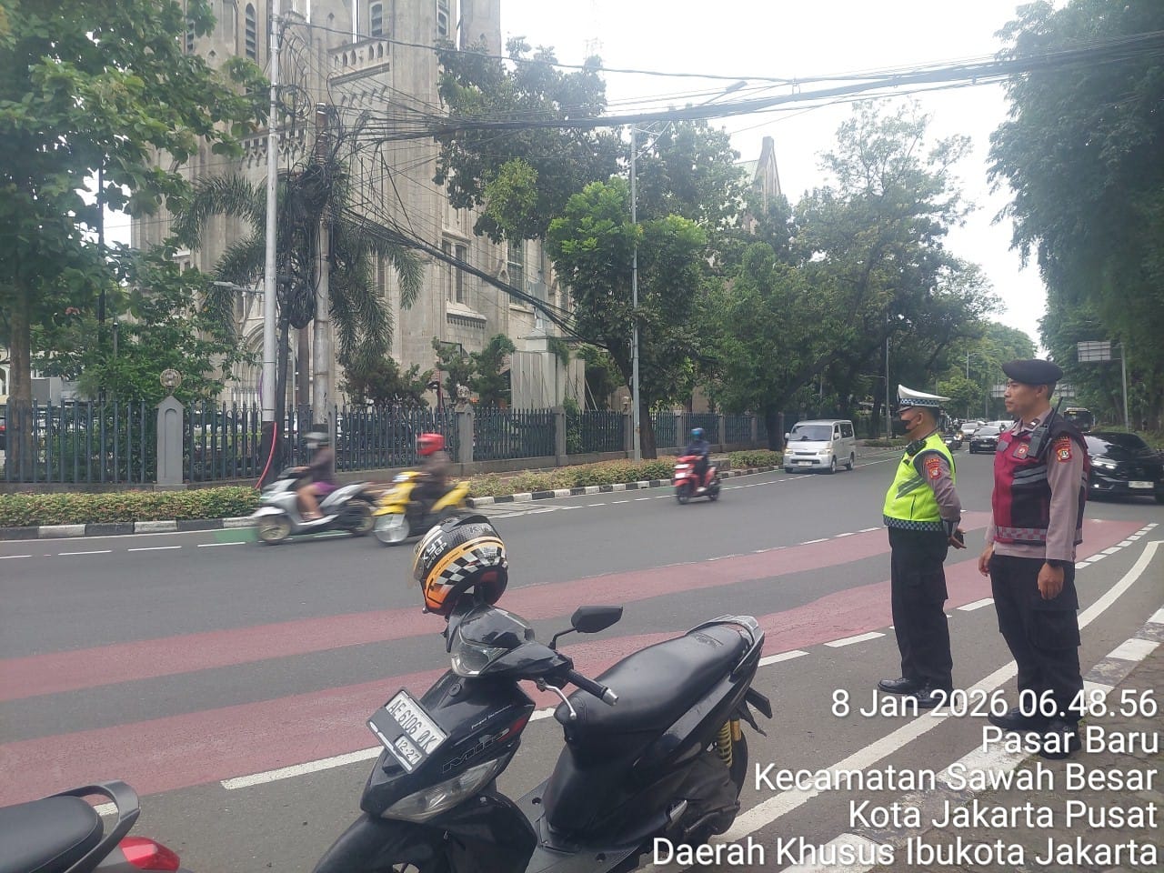 Jakarta Pusat — Polsek Sawah Besar melalui Unit Samapta bersama Satlantas melaksanakan pelayanan pagi berupa pengaturan lalu lintas di depan Masjid Istiqlal hingga Pertigaan Katedral, Kelurahan Pasar Baru, Kecamatan Sawah Besar, Kamis (8/1/2025). Kegiatan yang dimulai pukul 06.00 WIB ini bertujuan mencegah kemacetan, mengantisipasi kejahatan jalanan, serta memberikan rasa aman dan nyaman bagi warga yang memulai aktivitas pagi. Dalam giat tersebut, petugas juga menyampaikan imbauan tertib berlalu lintas kepada masyarakat.