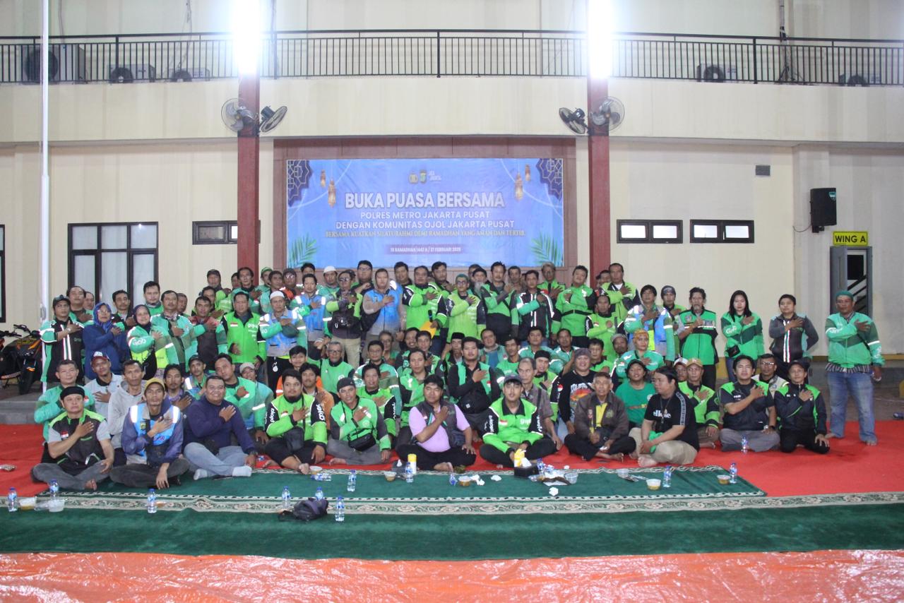 Jakarta – Polres Metro Jakarta Pusat menggelar buka puasa bersama Presidium Ojol Jakarta Pusat di Lapangan Merah Mapolrestro Jakarta Pusat, Jumat (27/2/2026). Kegiatan yang diikuti sekitar 500 peserta itu dirangkai dengan pembacaan Deklarasi Apel Siaga Kamtibmas Jaga Jakarta.