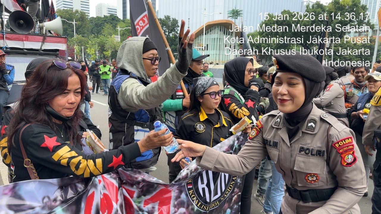 Jakarta Pusat — Kepolisian membagikan makanan ringan dan air mineral kepada massa aksi unjuk rasa dari Dewan Presidium Koalisi Ojol Nasional (KON) yang berlangsung di Silang Monas Selatan, Jakarta Pusat, Kamis (15/1/2026).